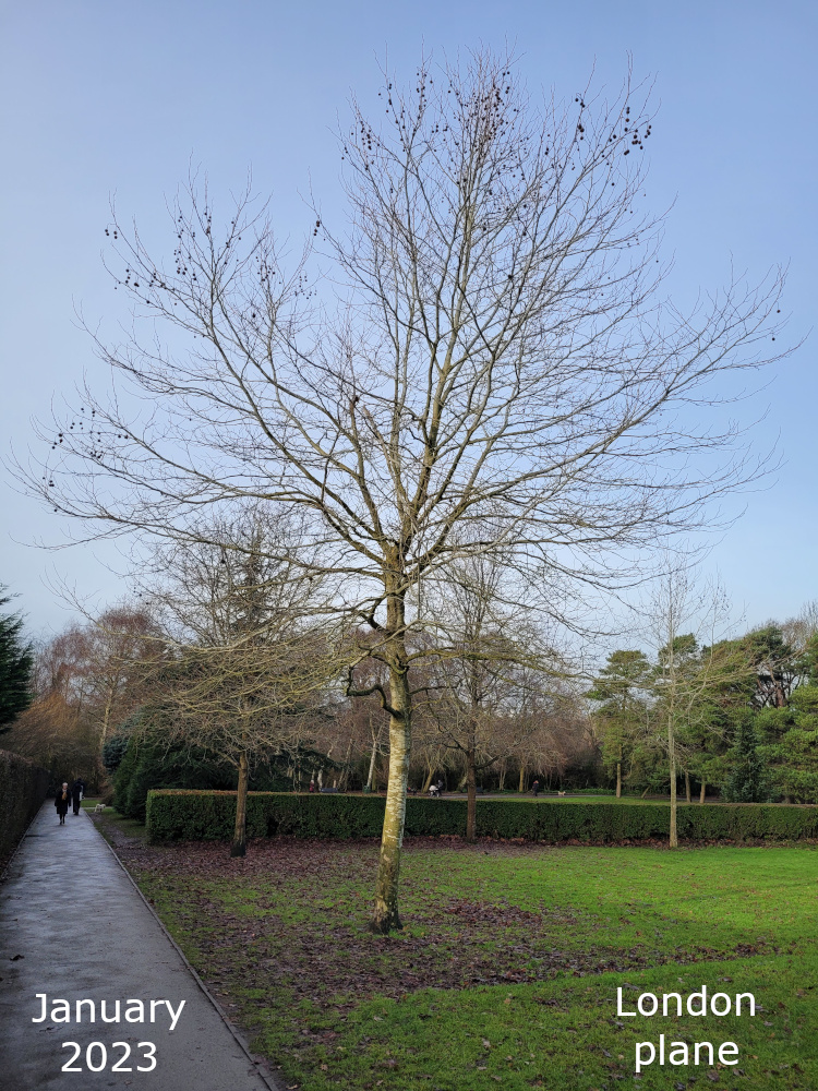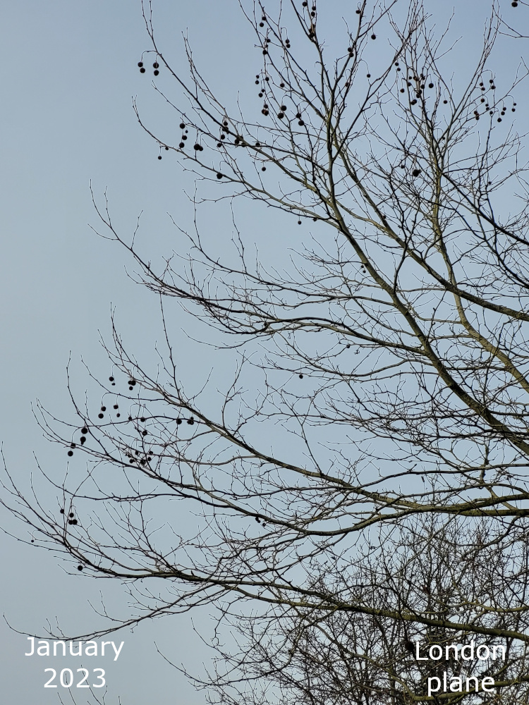 The very first photos I took, though, were of a London plane, as the round spiky fruits were very noticeable against a grey cloudy sky. They caught my eye like some Christmas ornaments dangling from the tree top. It won’t be long before they become fluffier balls and begin to break up and disperse.
