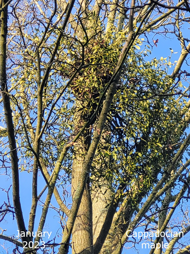 The other tree which I took pictures of is a Cappadocian maple and the tree itself was not the point of interest but the cluster of green high up in its branches. Viscum album or mistletoe in English. I would think its Latin name roughly translates as ‘sticky white’ which just about sums up its berries. Mistletoe is commonly thought of as a companion to apple trees but it will quite happily grow on lime, hawthorn and poplar and in this case a maple tree. It’s a semi-parasitic, evergreen shrub and this one is a sizeable specimen so I’ve no idea how long it’s been growing there. I didn’t notice it in the summer but then there were all the tree’s leaves to camouflage it. It reminds me that last year we saw some mistletoe in a lime tree at the front of the park – I should go check to see if it’s still there and if it has grown.