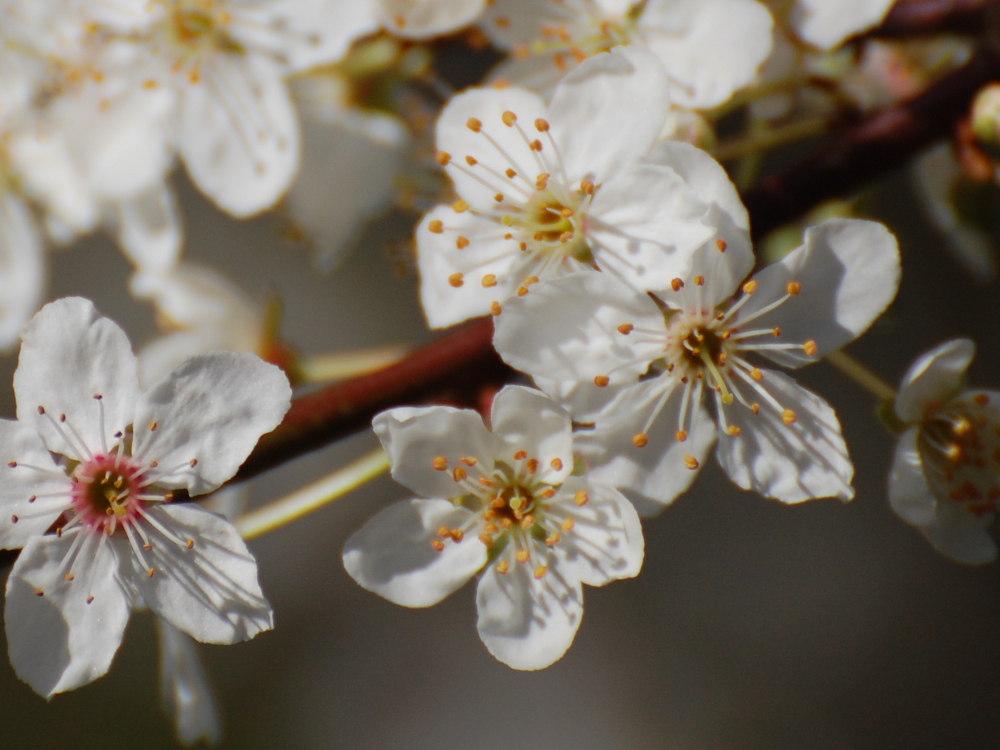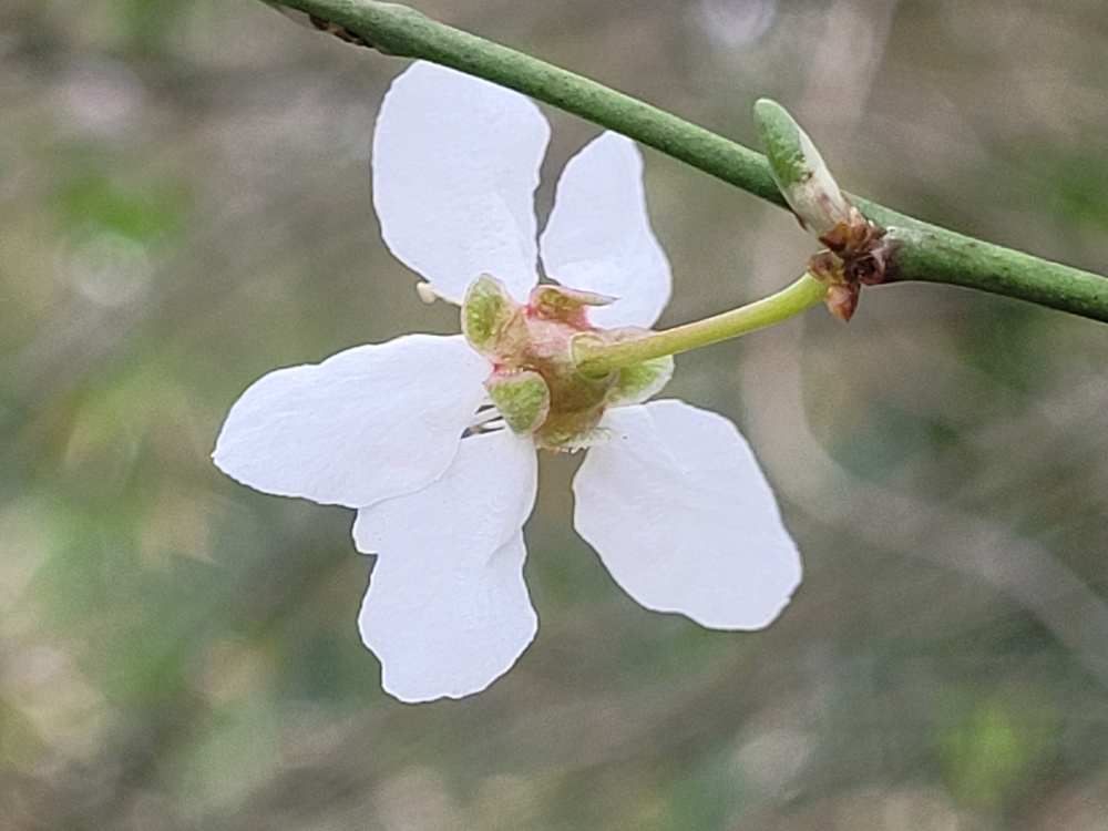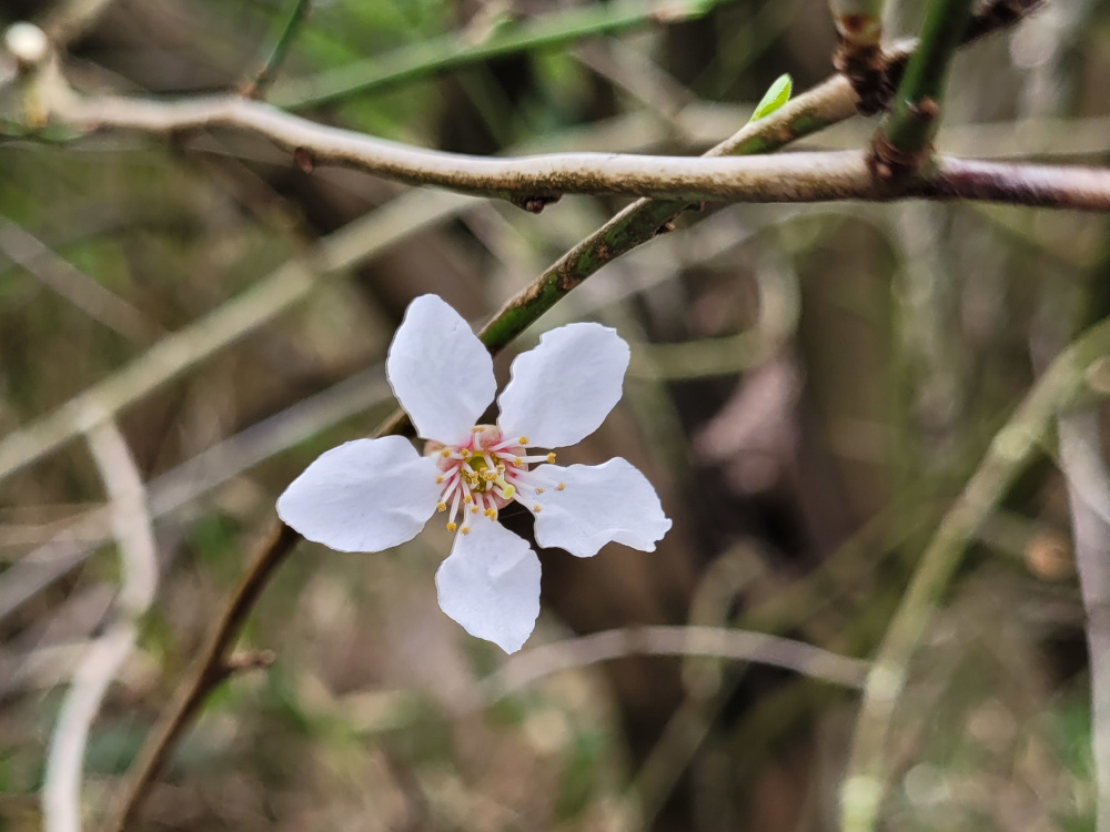 One Prunus species that has flowered so far is the cherry plum. A small tree alongside the pond has been in blossom for a week or so. It is Prunus cerasifera and the small white flowers look like blackthorn but if you look behind the flower the sepals are bent backwards whereas the blackthorn’s sepals cup the petals. Another, larger cherry plum is next to the path down the hill with the hawthorn hedge. This one is still in bud and is just about to flower so it is behind last year’s timing. The tree had finished blossoming by the end of March, last year. A third cherry plum that was in full bloom by early March last year is near the Thrive garden close to one of the large oak trees. These are usually the first Prunus to blossom, but they are a plum tree not a cherry tree, just a small plum. All of these tree have a good number of flower buds on them. One tree has started to bloom, the other two are close to it. I wonder if the current cold spell will delay the second two in blossoming or whether they stick to a rigid timetable. My bet is on delay. There is too much energy tied up in those flowers to risk opening them in the current cold spell.