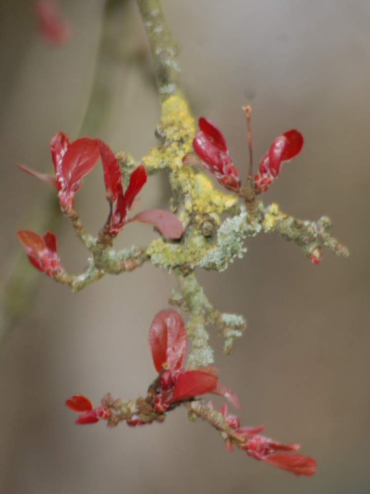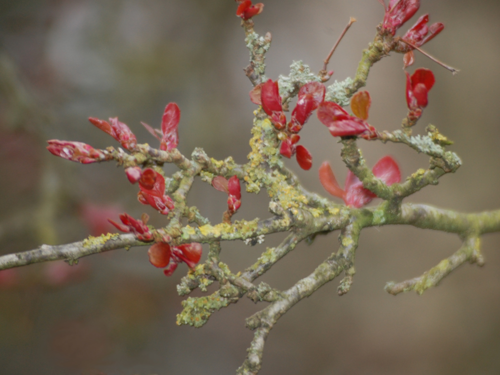 In the meantime, some of the next trees to blossom are busy with their leaf buds. Various apples, pears and cherries will bring out a flush of leaves before they blossom in early to mid April. Some of the leaves are just as glorious as the blossom, emerging in a wonderful maroon red.