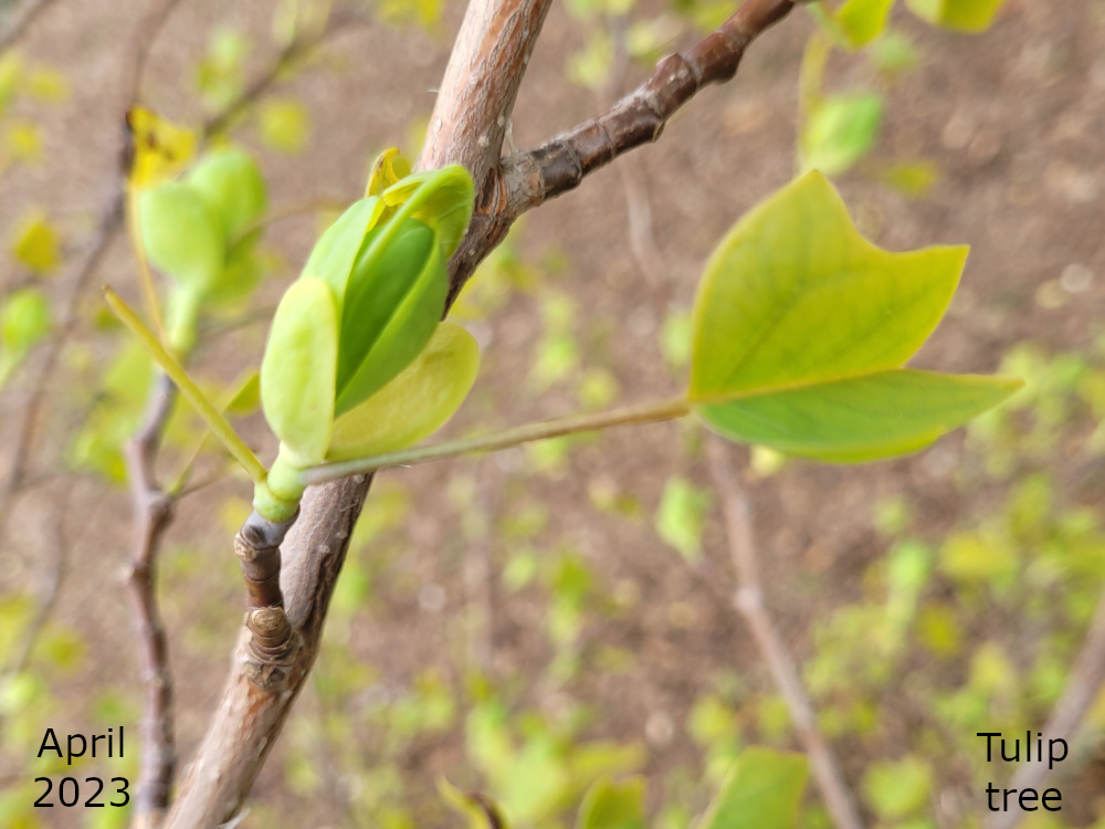 Come April of this year and trees are starting to leaf out and others are producing buds. So it’s time to monitor the Tulip tree. I notice the first sign of tiny leaves at the start of April. By mid April the tree is full of small leaves and what look like buds. Time to get out the long lens on the camera for a closer look. Sure enough there are green, elliptical buds with a yellowish covering and also some pale brown, spiky objects. What are they I wondered? Are these flowers? Back to the interwebs to find out. And back each day to check on progress. All through the rest of April and into May the buds seemed to get fatter and the spiky things stayed the same. Turns out these were last year’s seed heads and by now I’d found a few of them on the ground. The seeds are wind-borne samaras and flake off from this central spike.