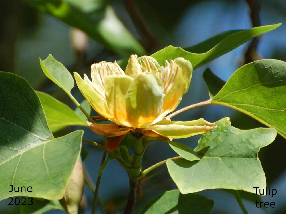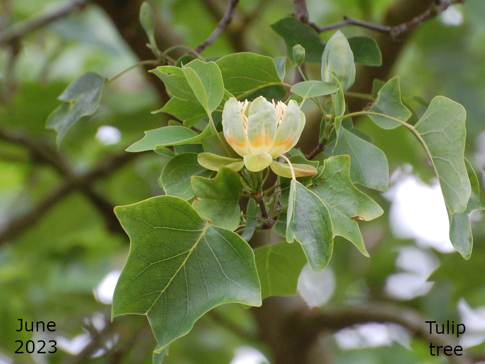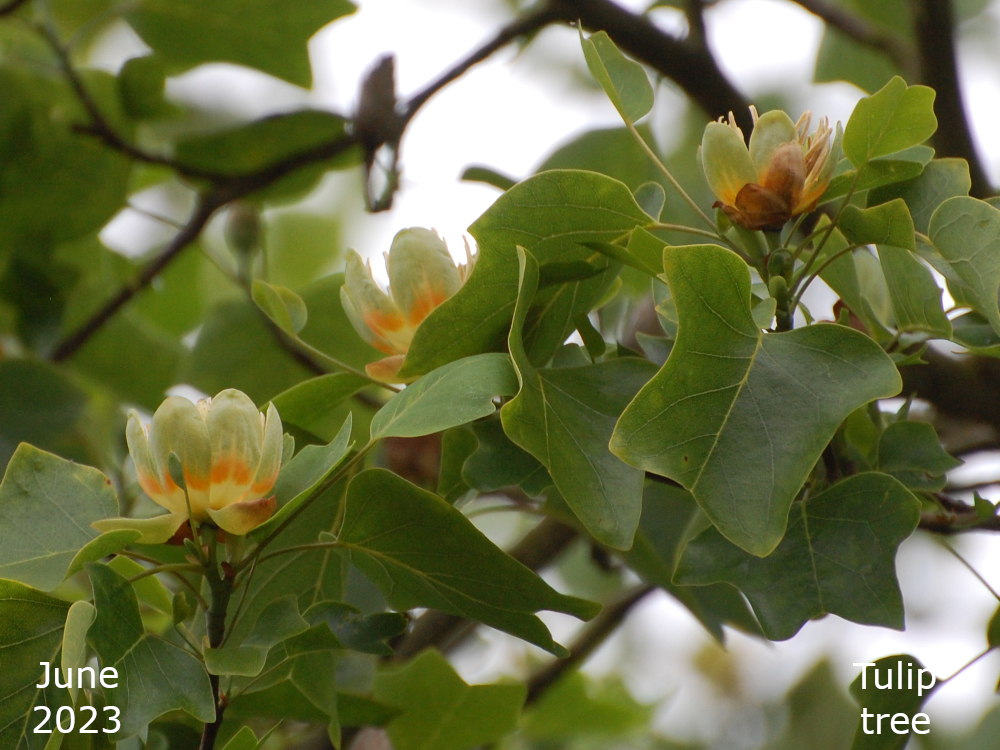 I was checking on the tree regularly, all through May, peering up into the branches using my long lens or binoculars. Plenty of buds in sight but no flowers. Then, just into June, on our daily walk all was revealed. The first of the flowers opened on June 6th. They weren’t easy to spot and still looked a little green. They were all quite high up, too, and almost hidden by the leaves but they were there and so it was time to go back home and get the camera and long lens. Over the next few days, with some good sunny days, more and more flowers emerged and the tree is now full of colour. You just have to look closely to really see it. And as the name suggests, the flowers look like tulips so I haven’t got a really good picture of the inside of the flower because they are all high up and pointing upwards and I’m only 5′ 8″.
