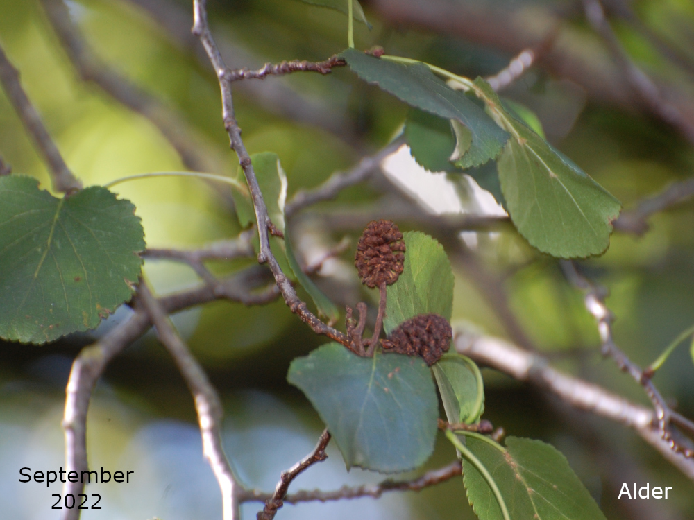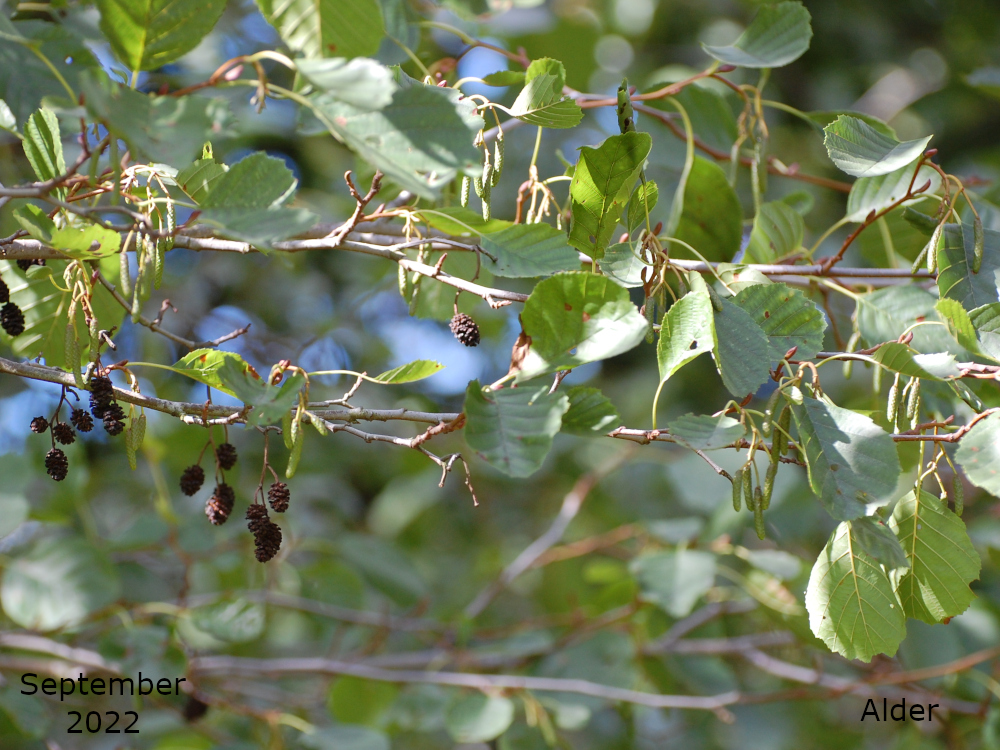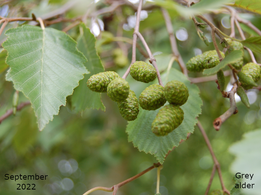 In September the pollinated female catkin has swollen and over the rest of Autumn will turn woody and brown. They can be seen alongside new, green male catkins, ready for next season, and old female catkins that have released their seed. The female catkins will be ready to release their seed early in Spring.