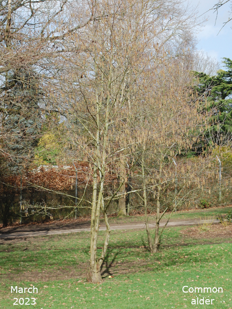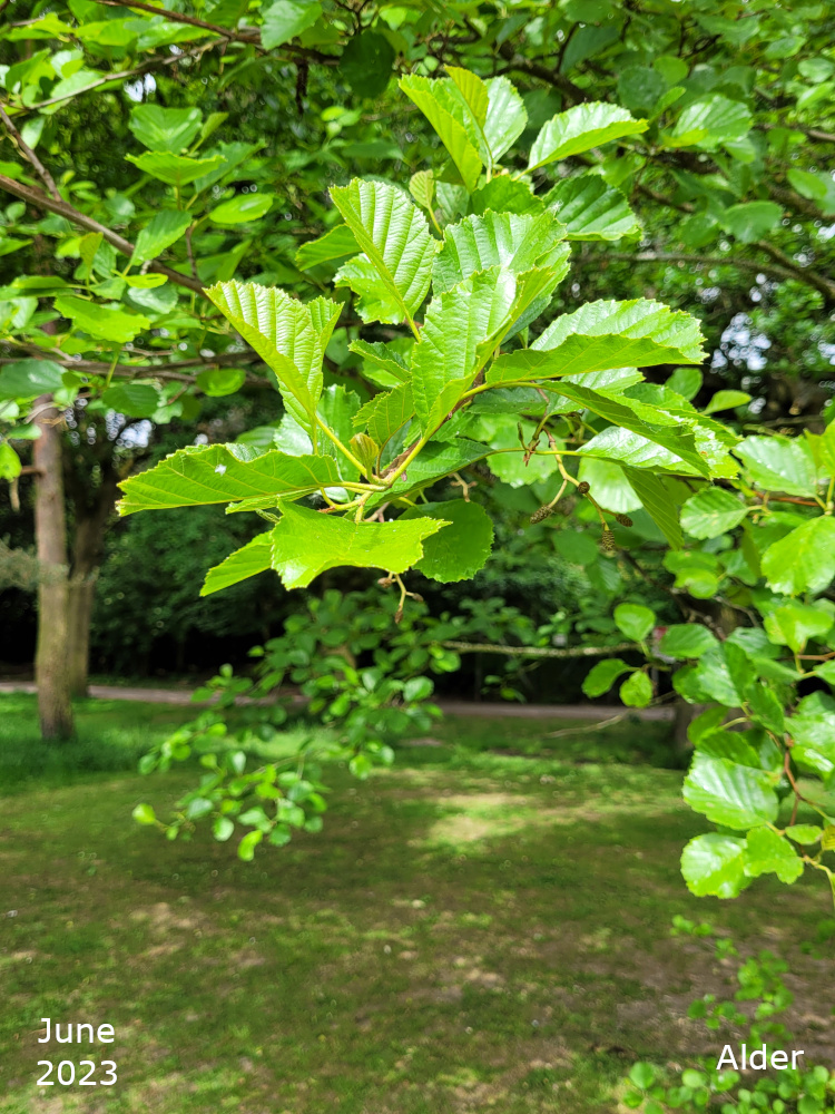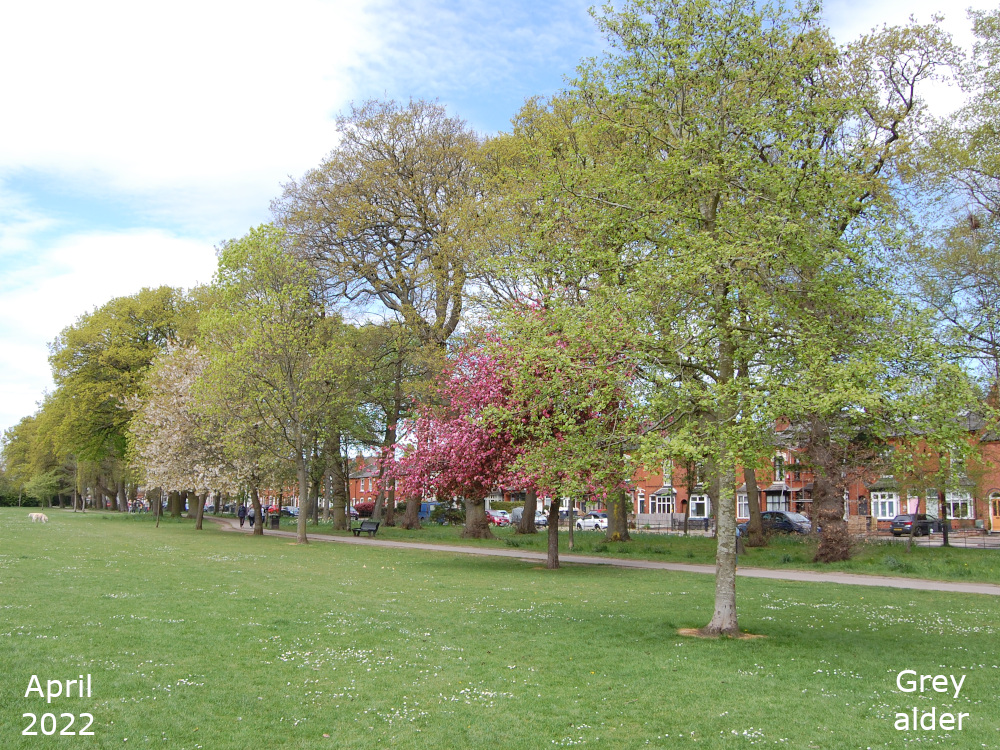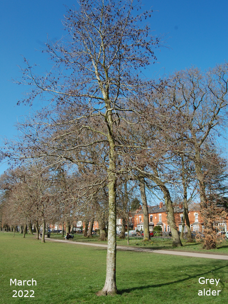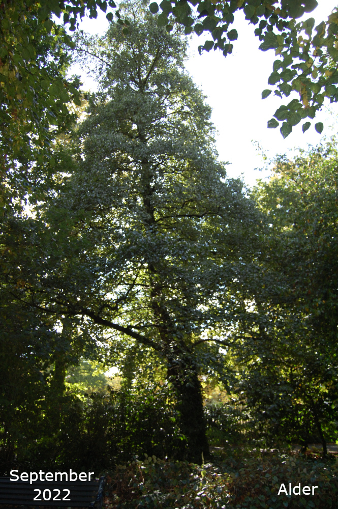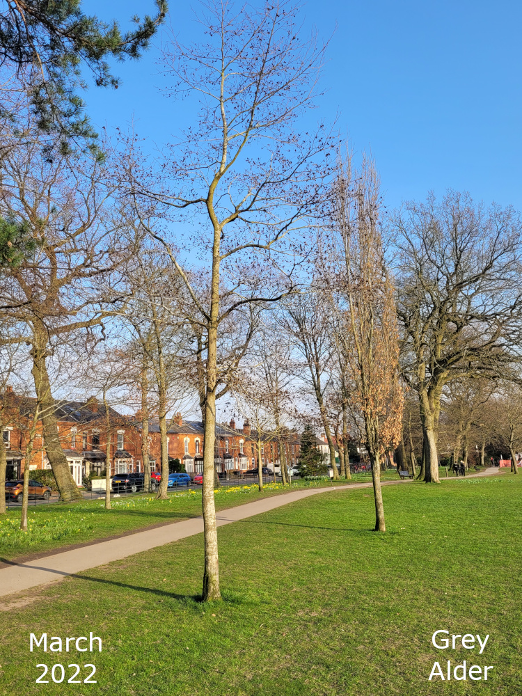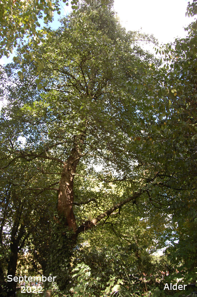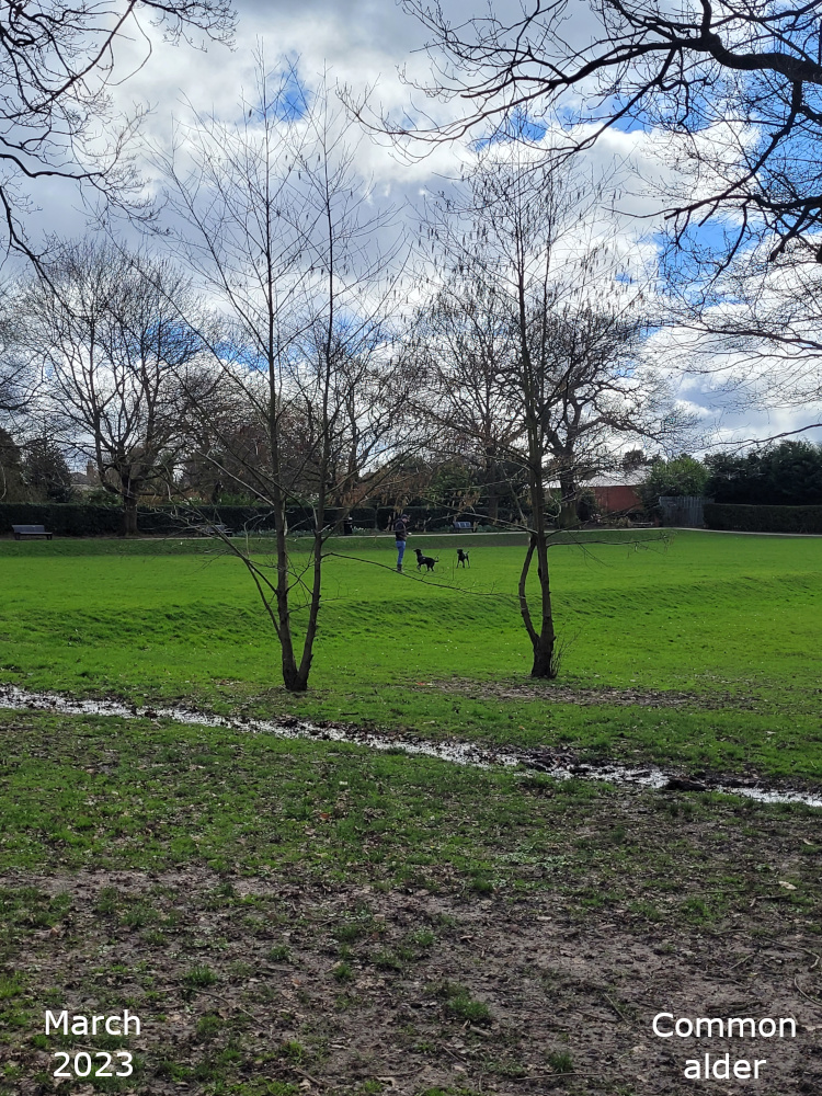 The remaining Alder are towards the bottom of the park, just off the path that goes down the hill past the Thrive garden. Turn left off the path past the flower bed, over the little stream, and the Alders are in a line. The two nearest the path are Common or Black Alder and the third one is a Grey alder.