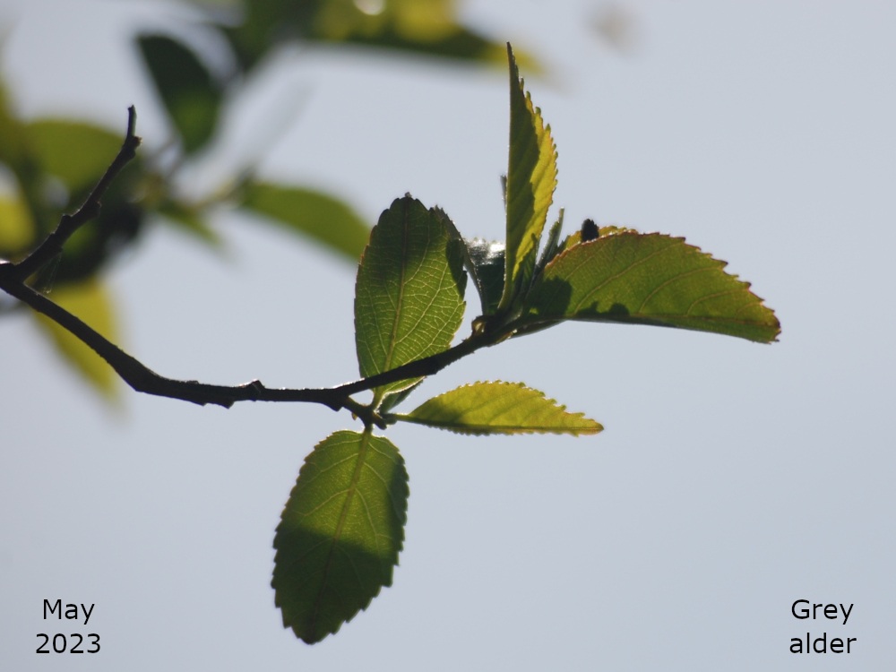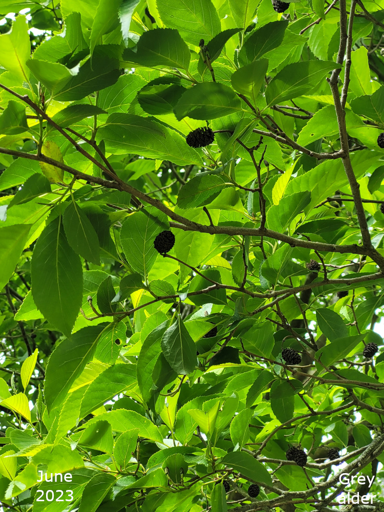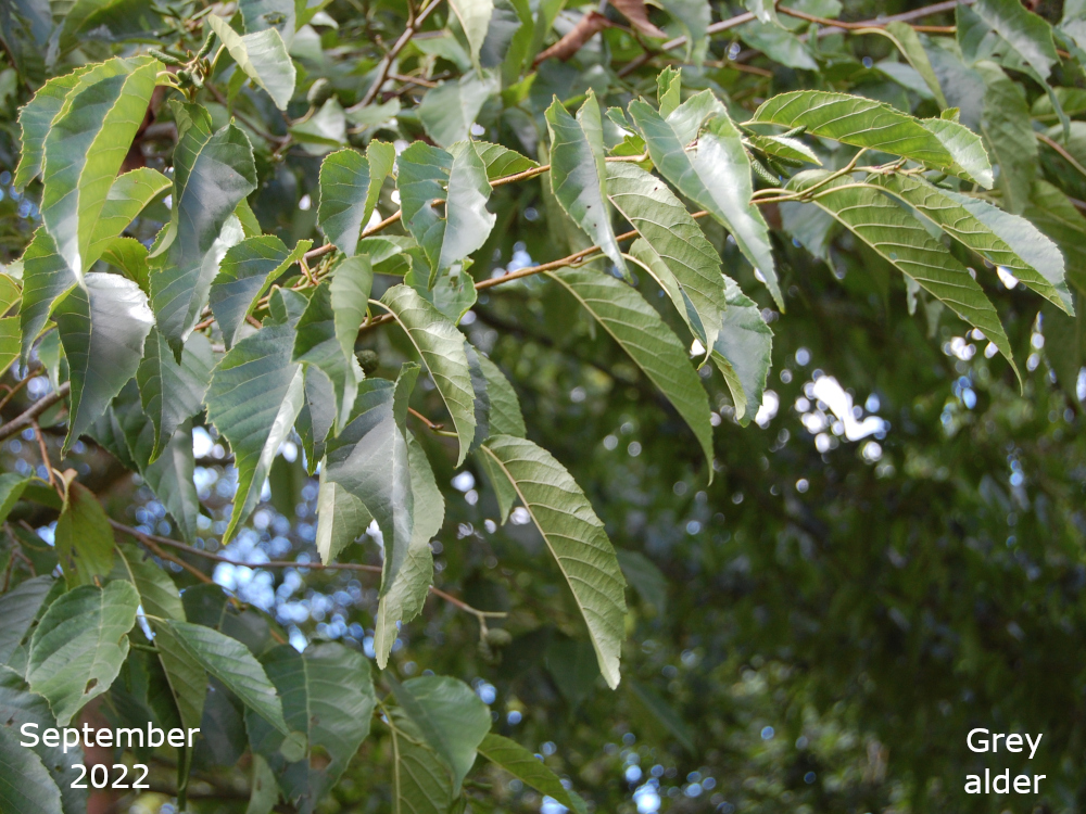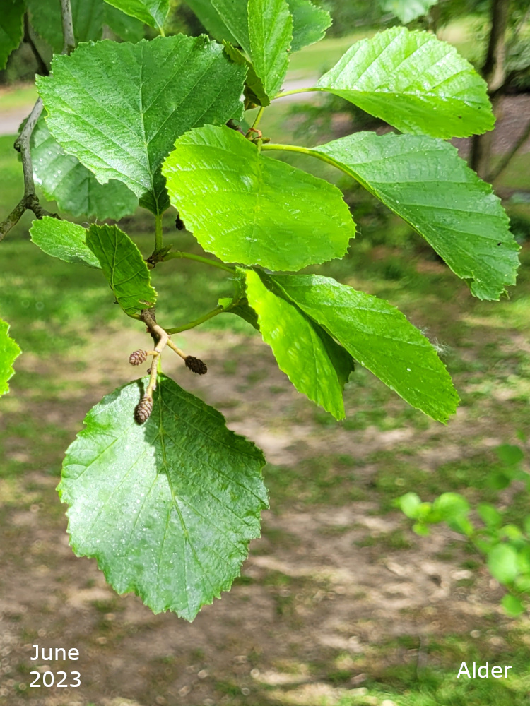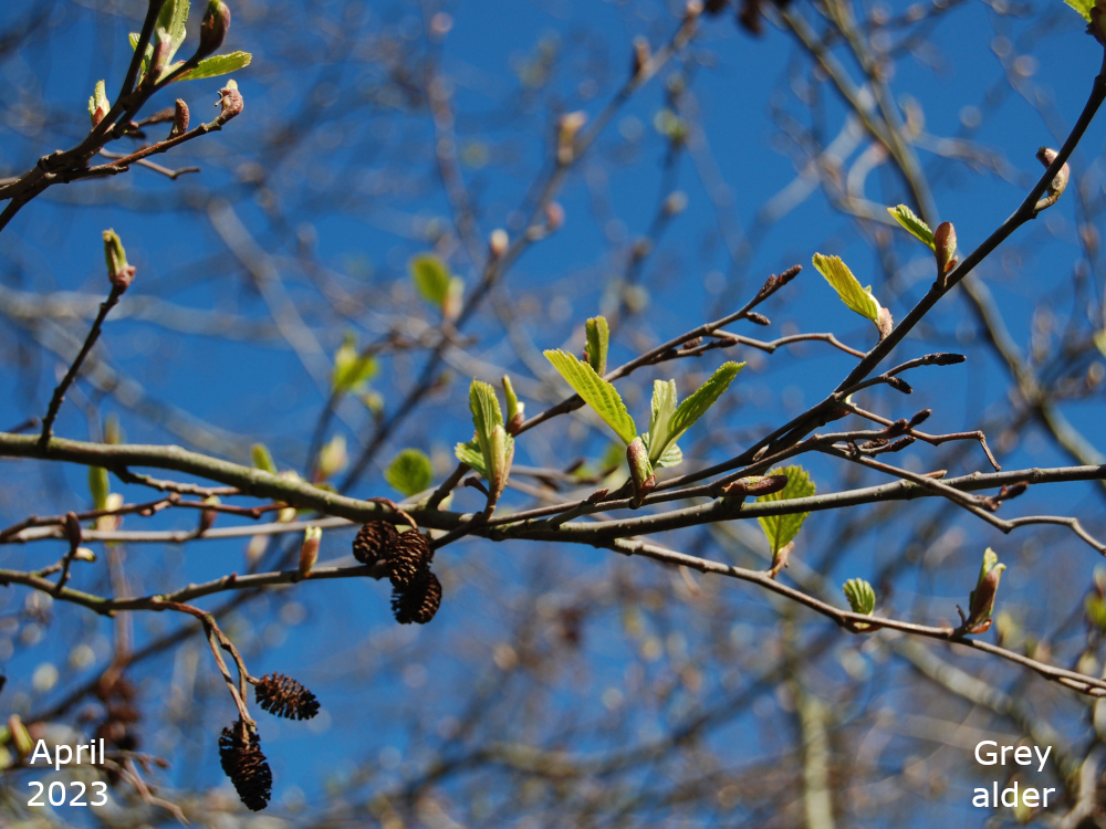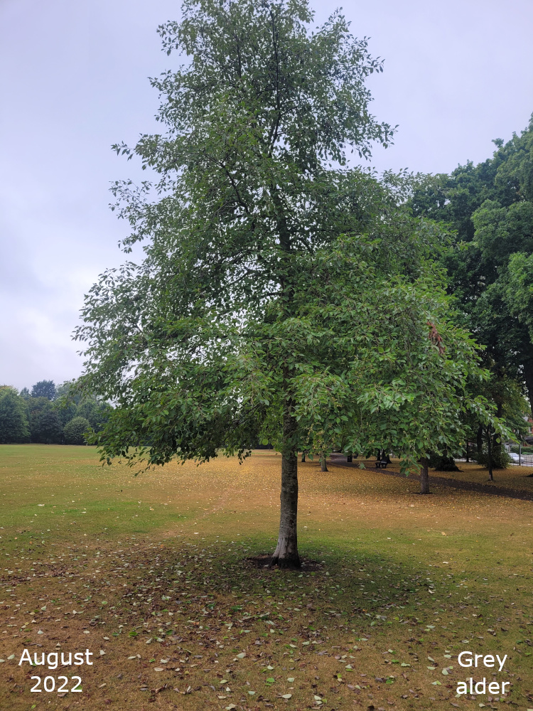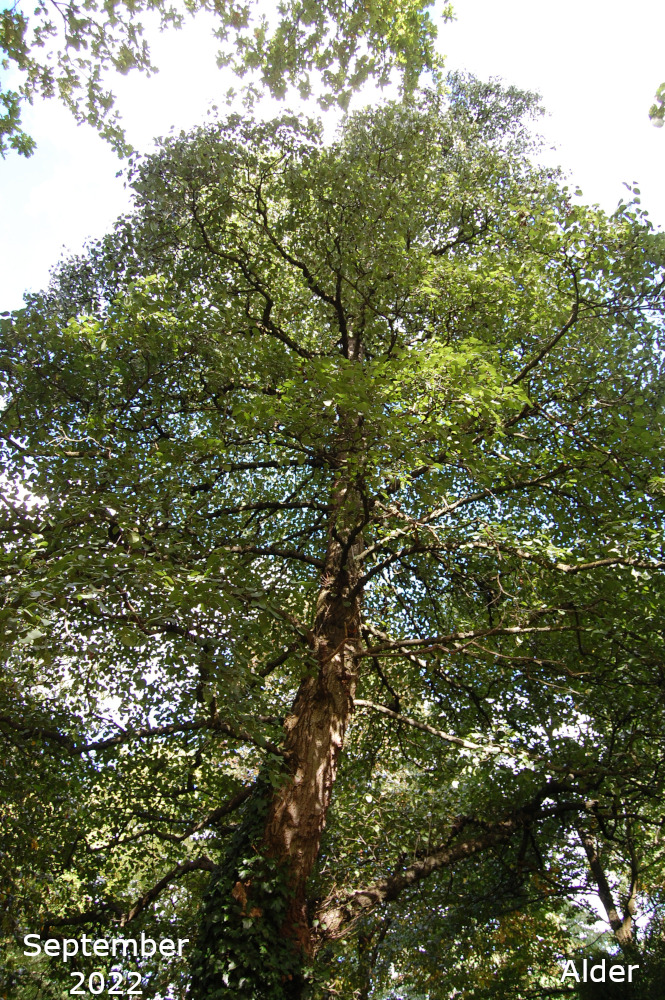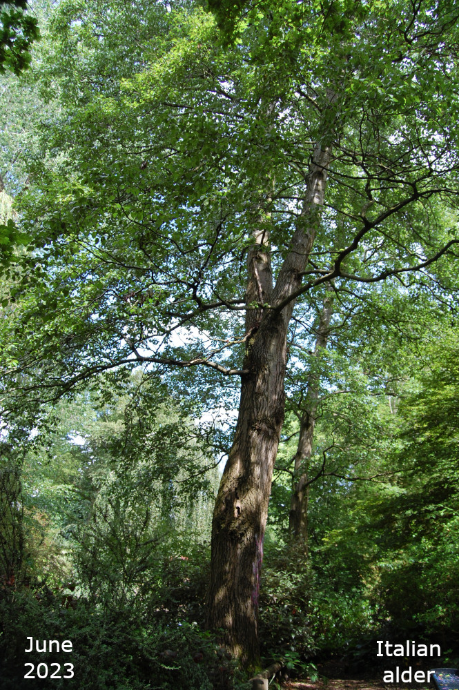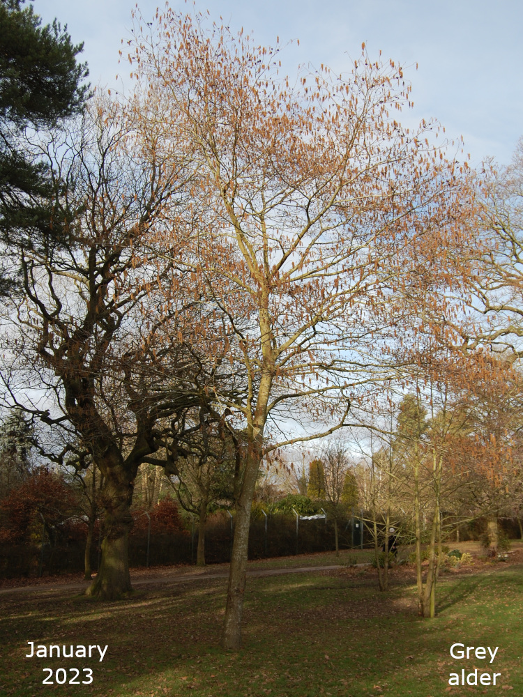 The remaining Alder are towards the bottom of the park, just off the path that goes down the hill past the Thrive garden. Turn left off the path past the flower bed, over the little stream, and the Alders are in a line. The two nearest the path are Common or Black Alder and the third one is a Grey alder.