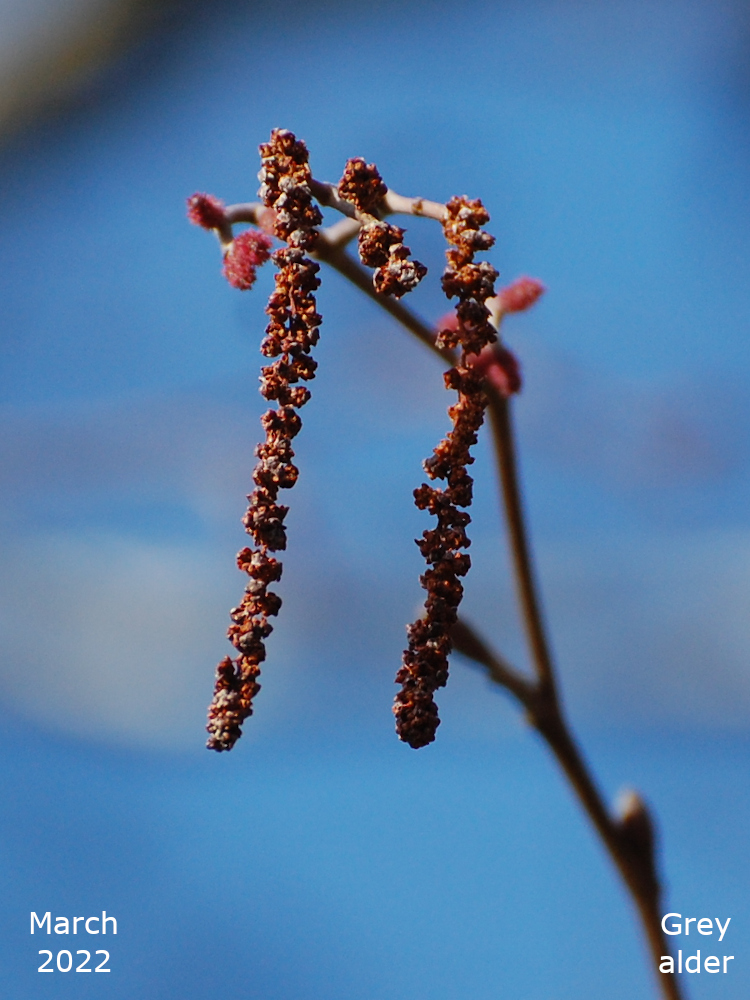 New female catkins can be seen in March when the male catkins mature and develop their characteristic purple scales and yellow flowers. The female catkin is quite small at this stage and it, too, looks purple.