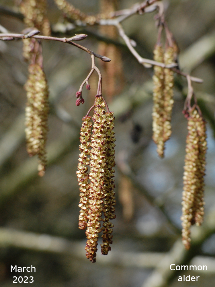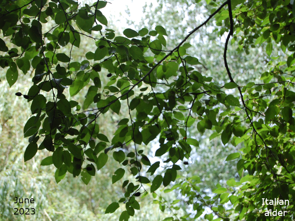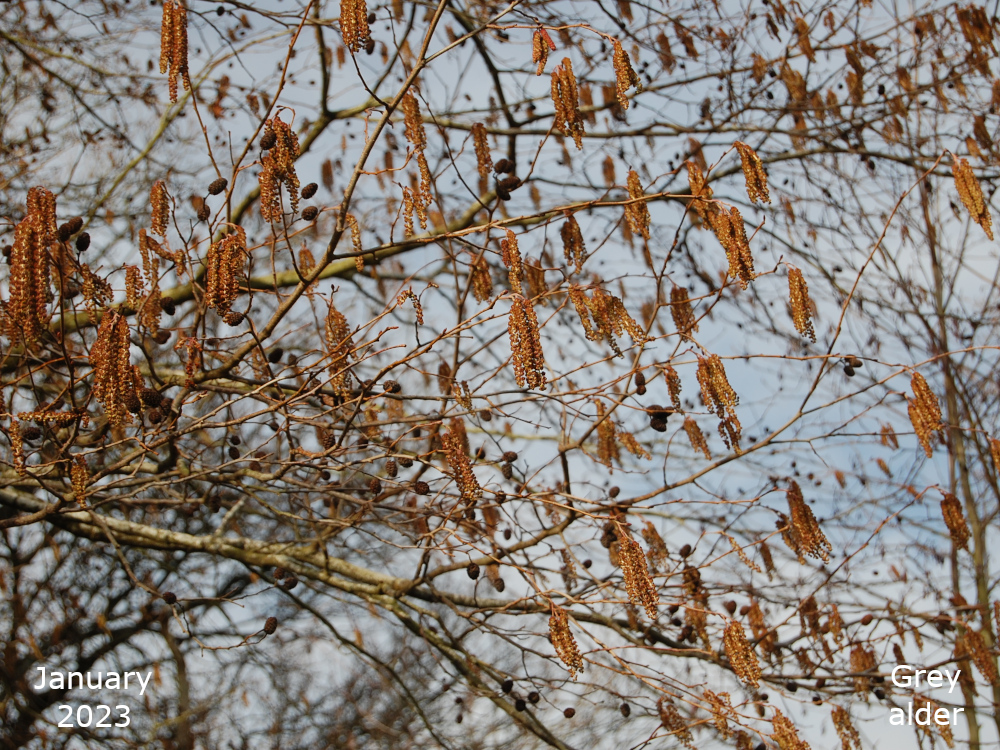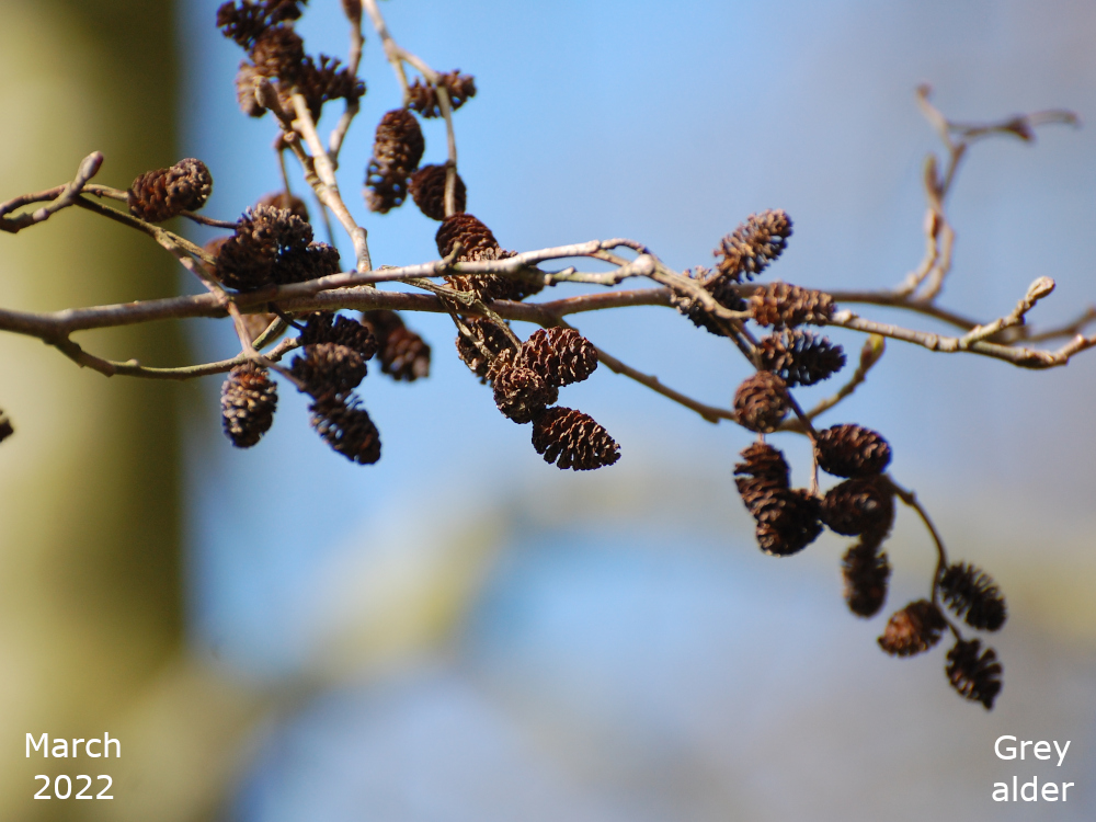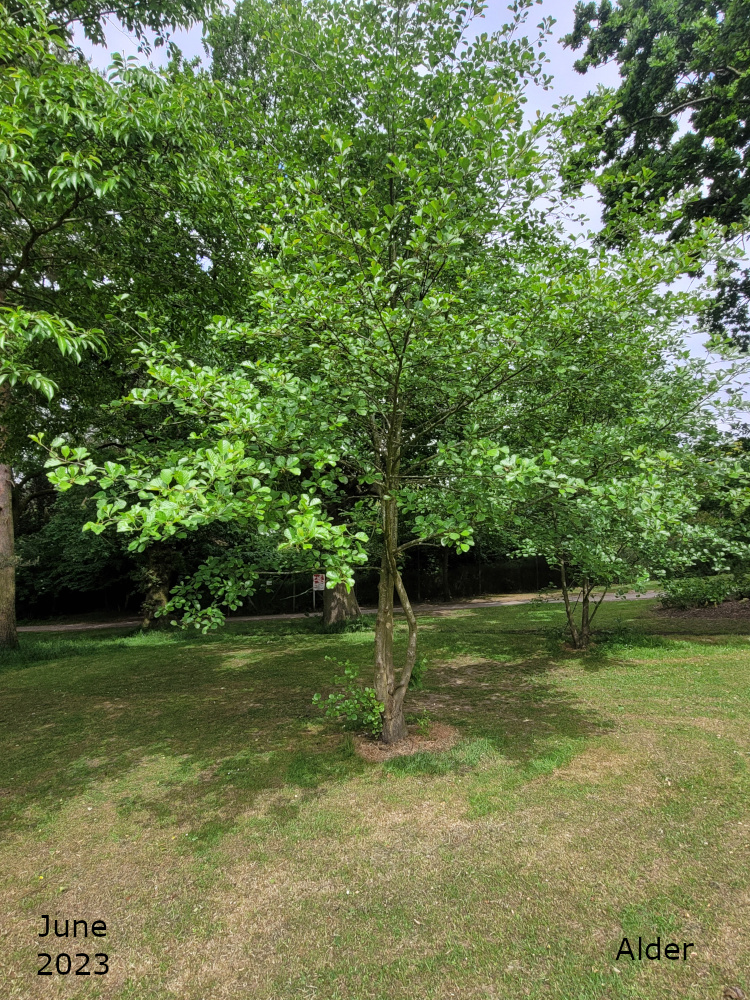 The Alder in the pond area is on the bank nearer to Avenue Road and is at the end nearer to the Grange Road car park. It’s near one of the benches on the edge of the pond. My App has identified it both as an Italian alder, Alnus cordata, and a Black alder, Alnus glutinosa. I’m going with the Italian alder, at the moment. The leaves are not the round shape of Black alder, they do not seem to have the same toothed edge as the Grey alder but they do not exactly look heart shaped which is what cordate means. Perhaps I just need to get some better photos.