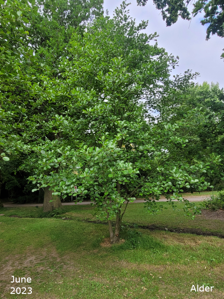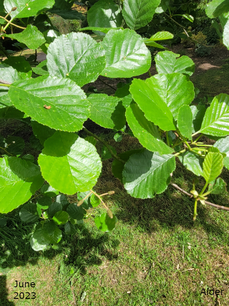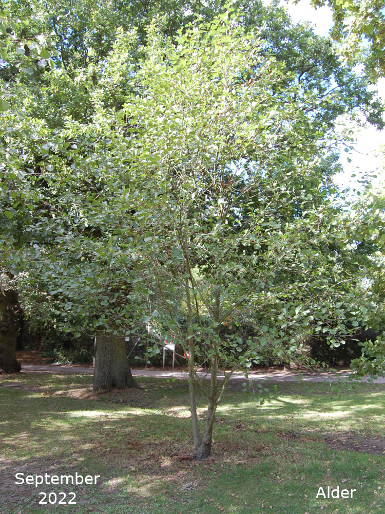 There is a large Alder in the space between the drive and the path, behind one of the benches. It is a Common alder or Black alder or simply and Alder, Alnus glutinosa. It has the usual rounded leaves of the Common alder.