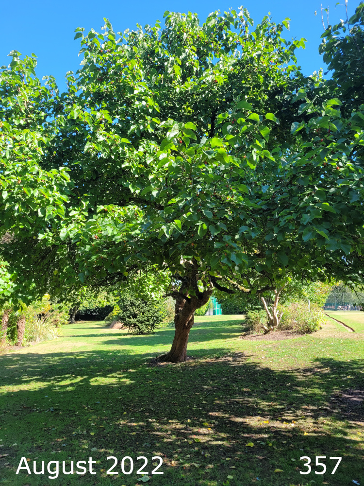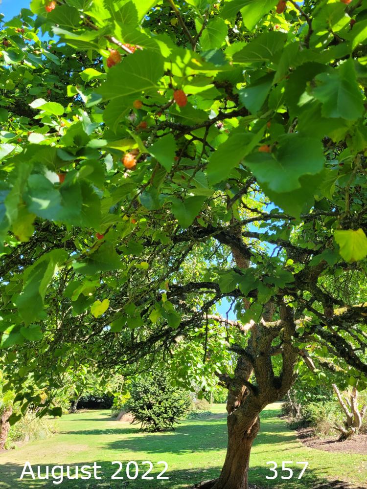Just below the corner of the bowling green this Black mulberry, Morus nigra, produces delicious fruit in the Autumn.