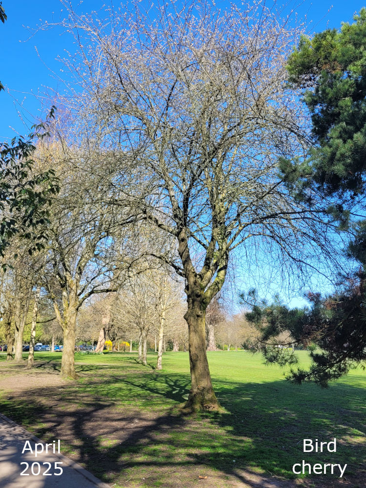 Wednesday, 9th. There are flower buds on the Medlar at the bottom of the park. There is a strong smell of Wild garlic around the pond. There are even more buds, looking like fairy lights, on the Tibetan whitebeam. There is blossom opening up on the Crab apple opposite. Japanese cherry, next to the car park is blossoming. The pink Bird cherries next to the old tennis courts are starting to blossom.
