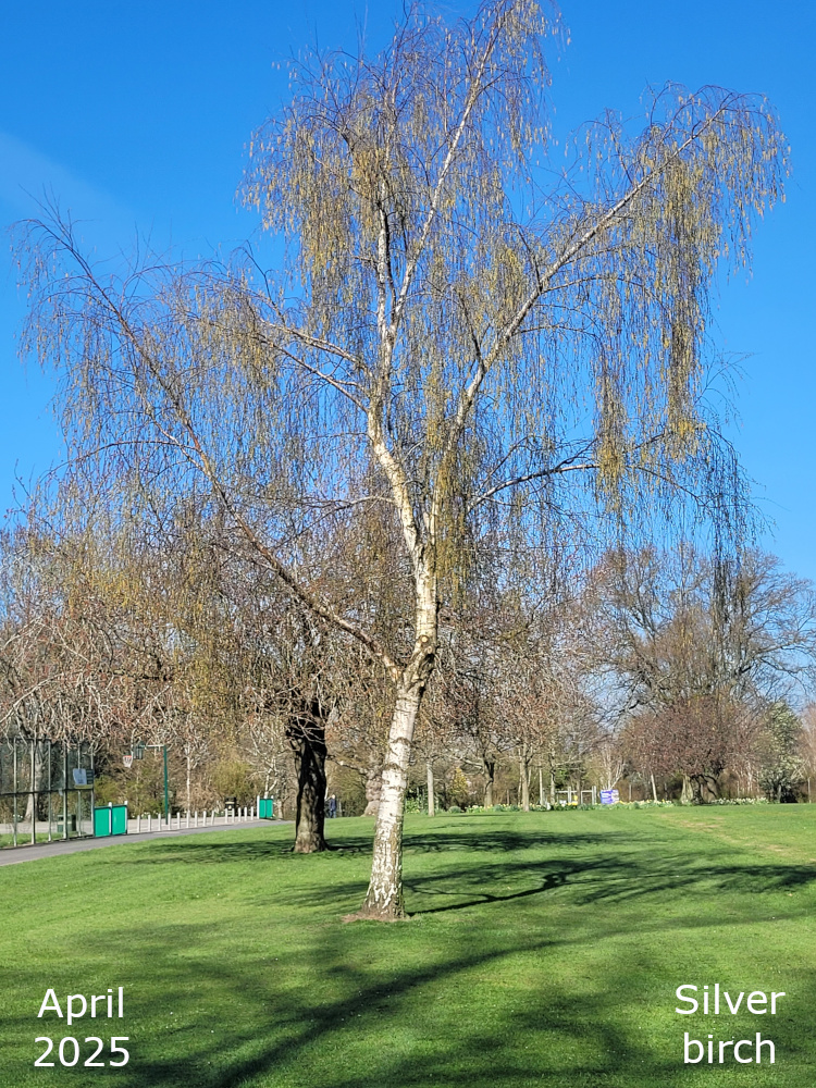 Friday, 18th. Silver birch is in full leaf now, next to the Japanese cherry in full bloom. Wild cherry finished. Hall crab apple blossoming.