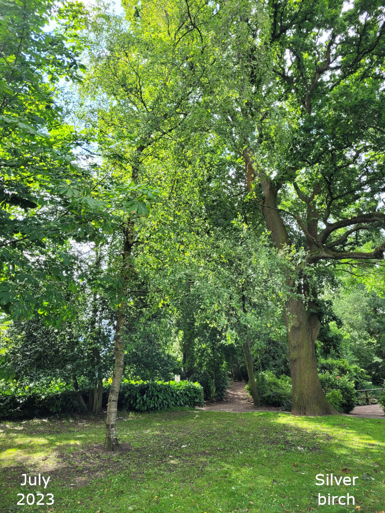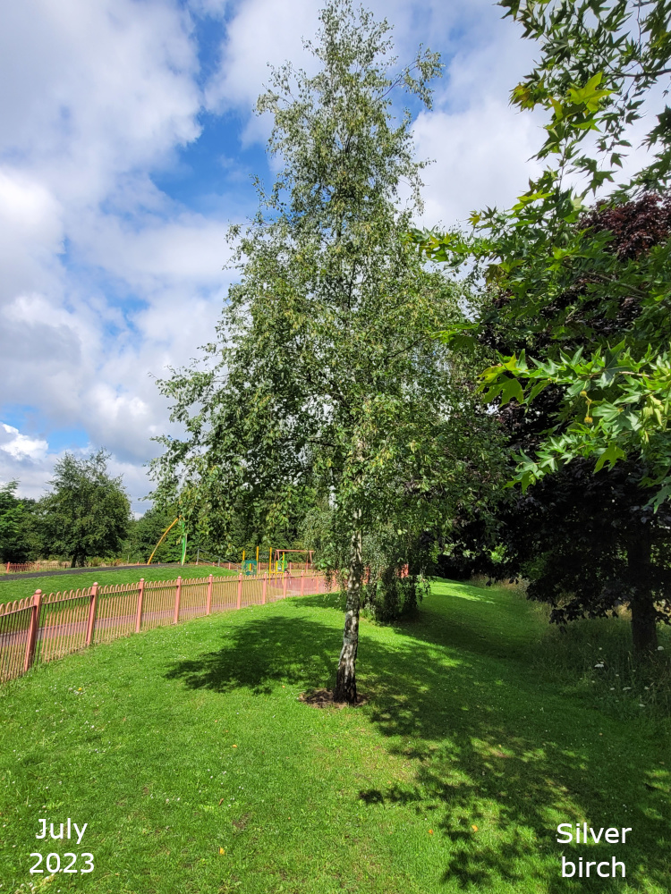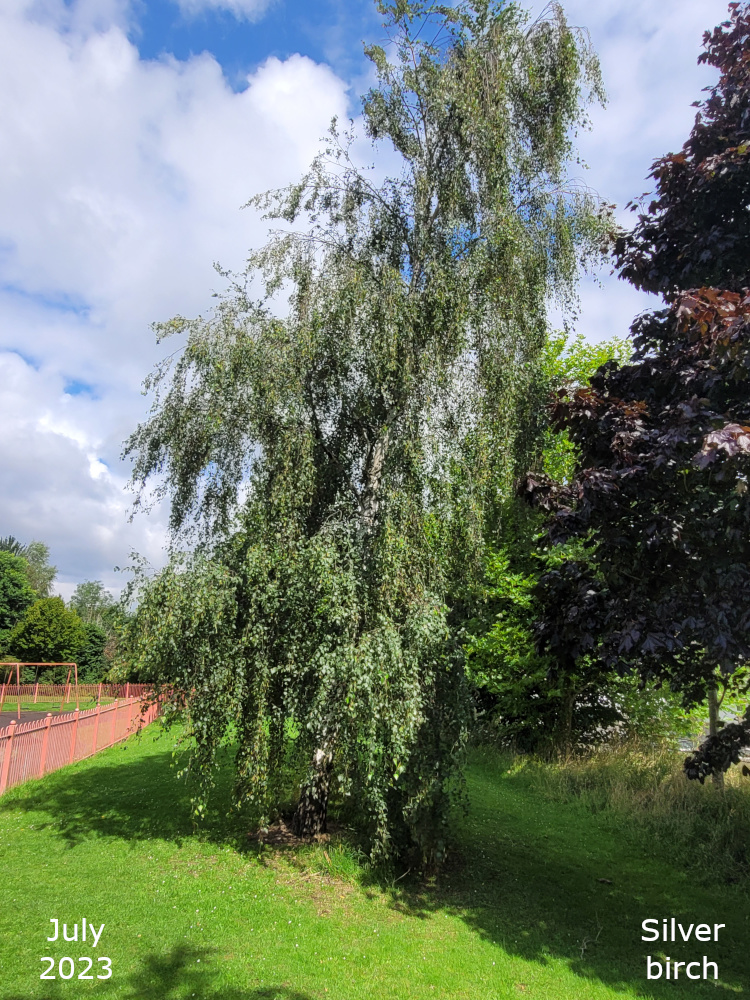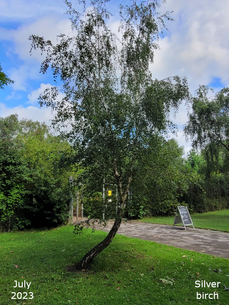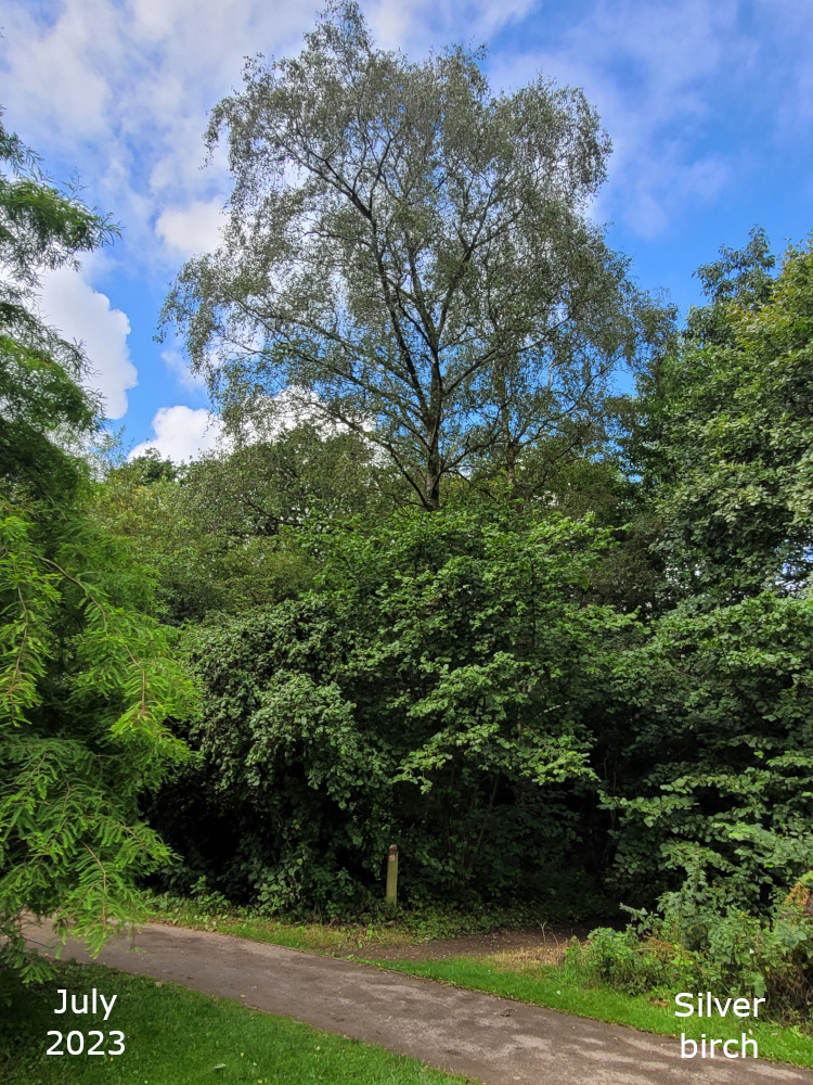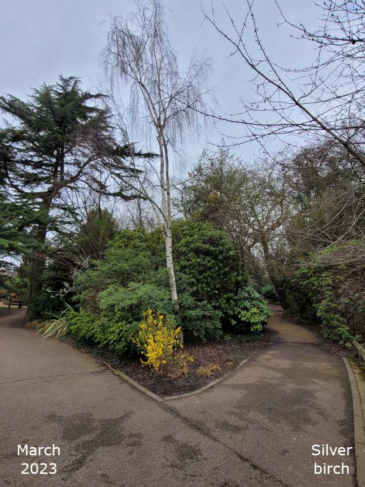 The small wooded area between the car park and the path has a Silver birch at one end. Just over the path, beside the old tennis courts, there is another Silver birch looking a bit like a scarecrow. Following that path towards the Thrive garden there are three more Silver birch near the end.