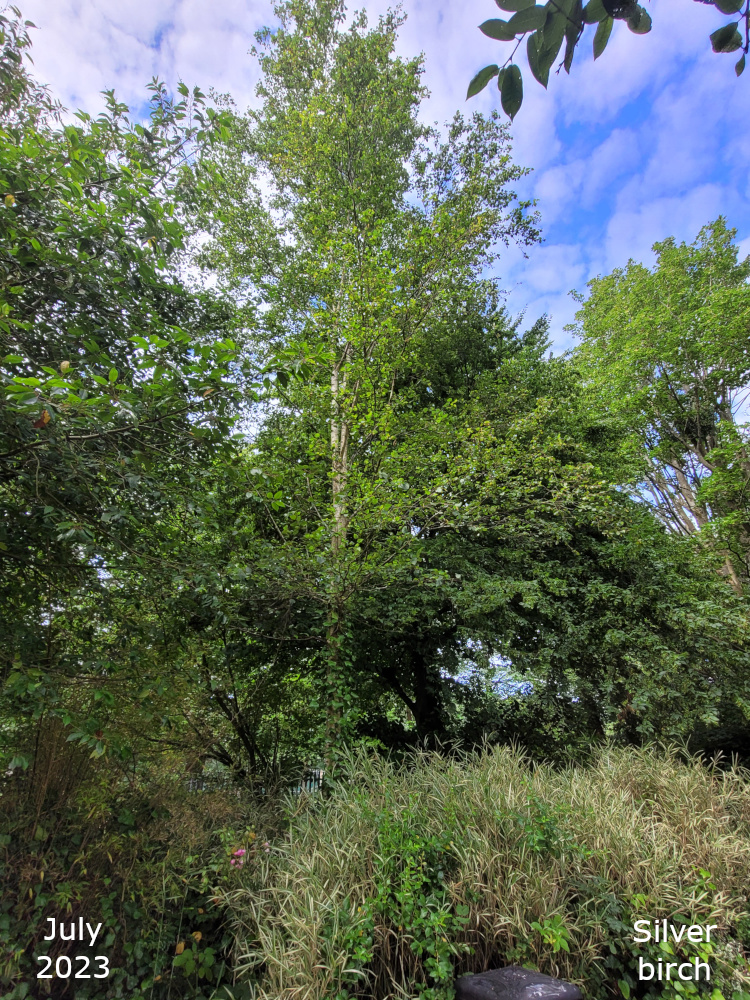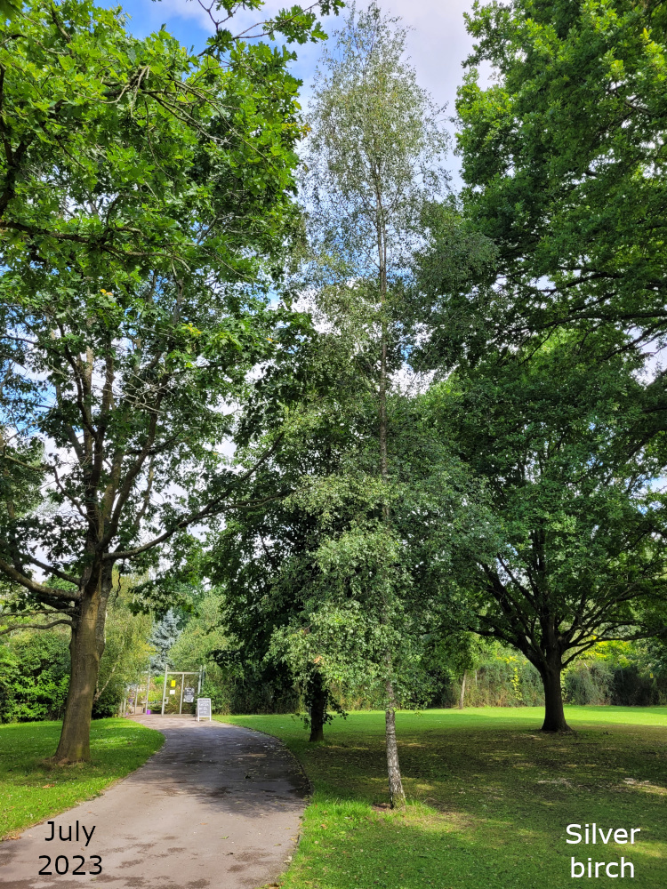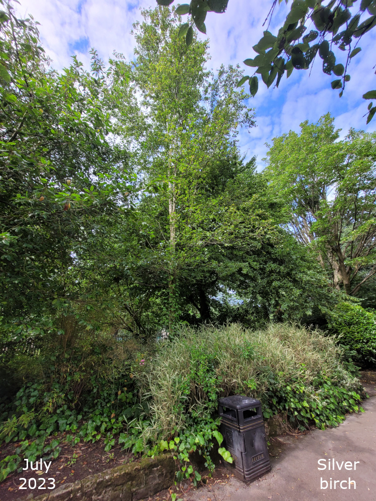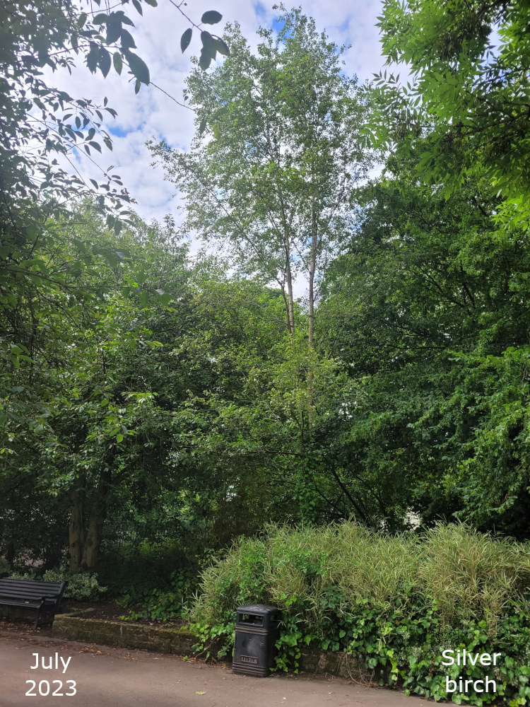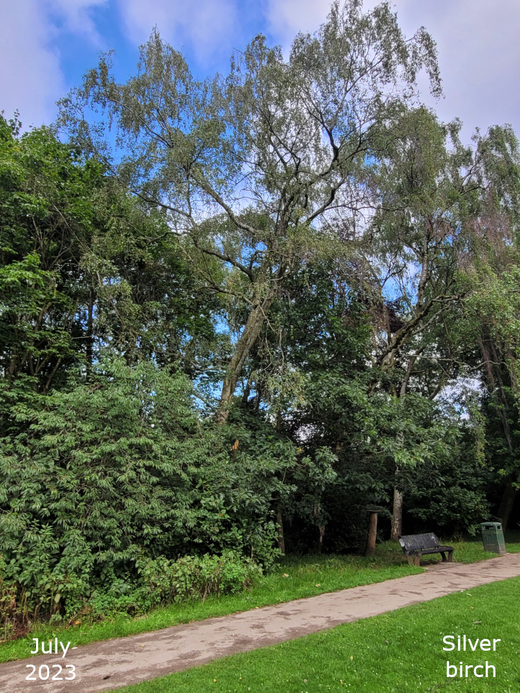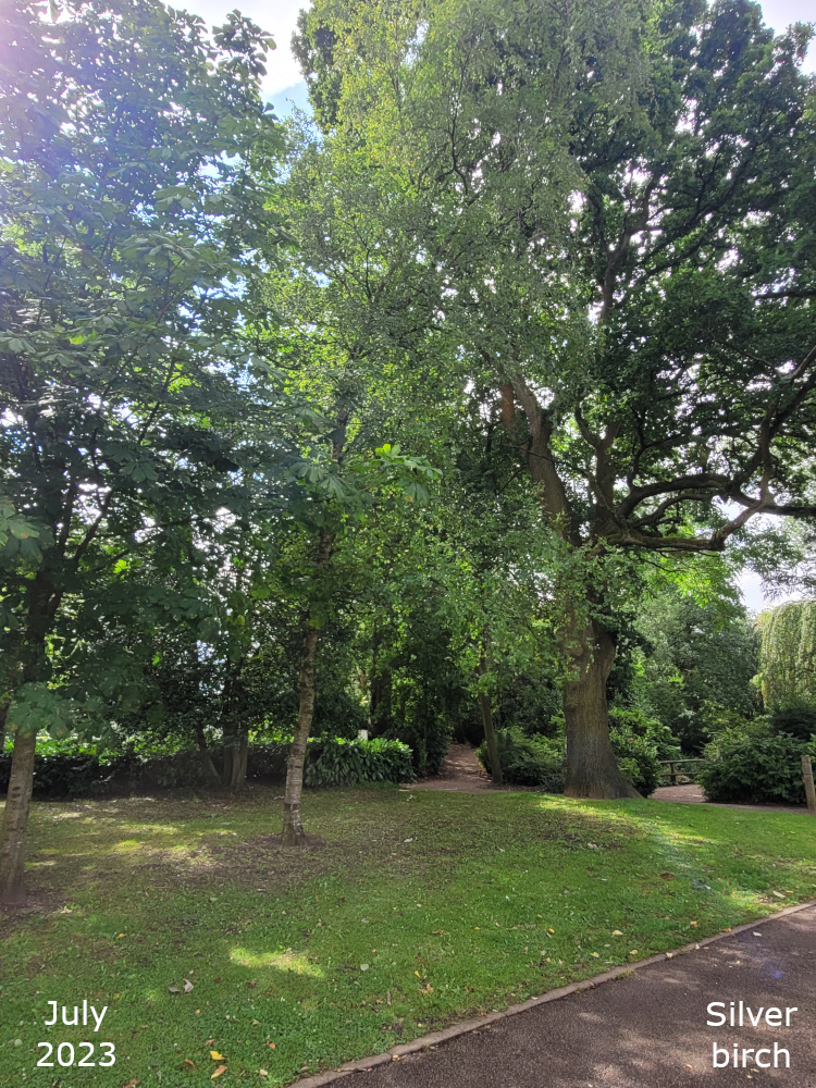 The small wooded area between the car park and the path has a Silver birch at one end. Just over the path, beside the old tennis courts, there is another Silver birch looking a bit like a scarecrow. Following that path towards the Thrive garden there are three more Silver birch near the end.