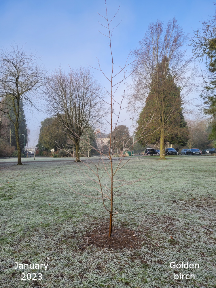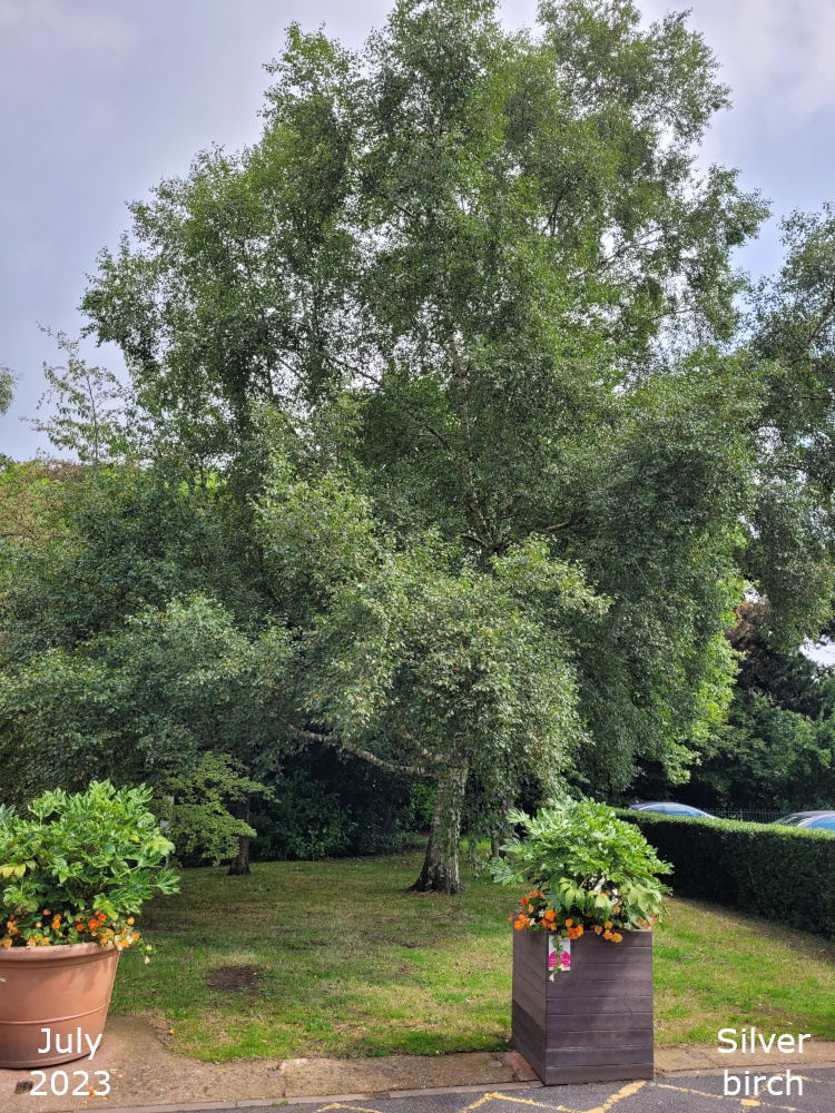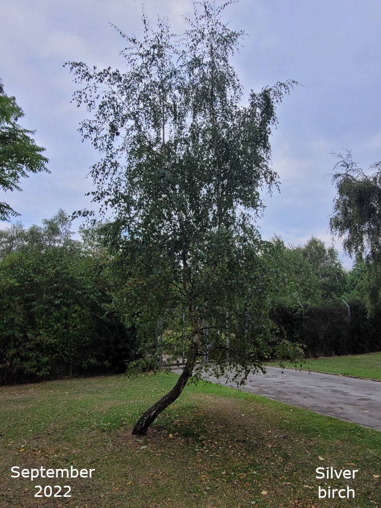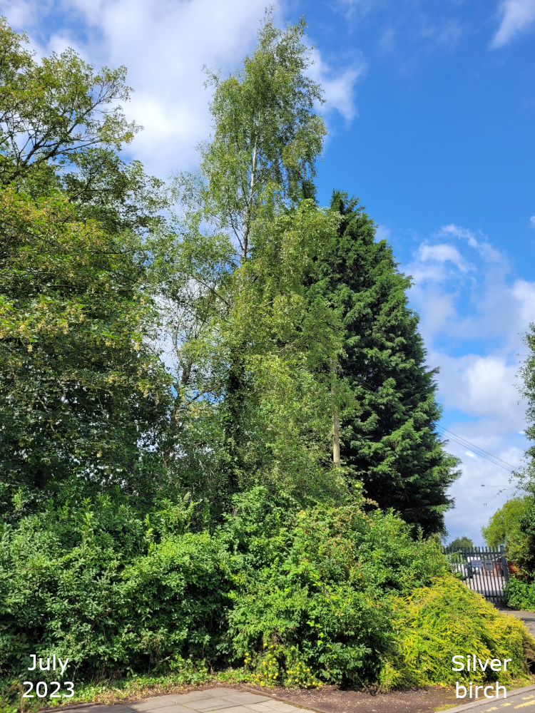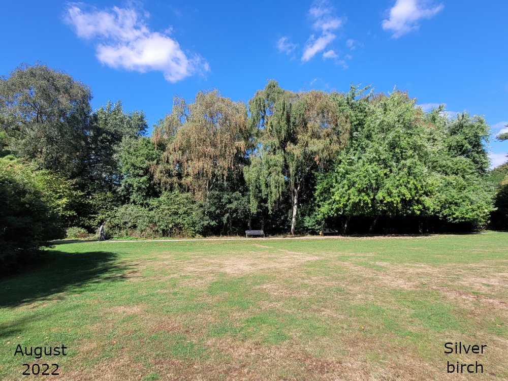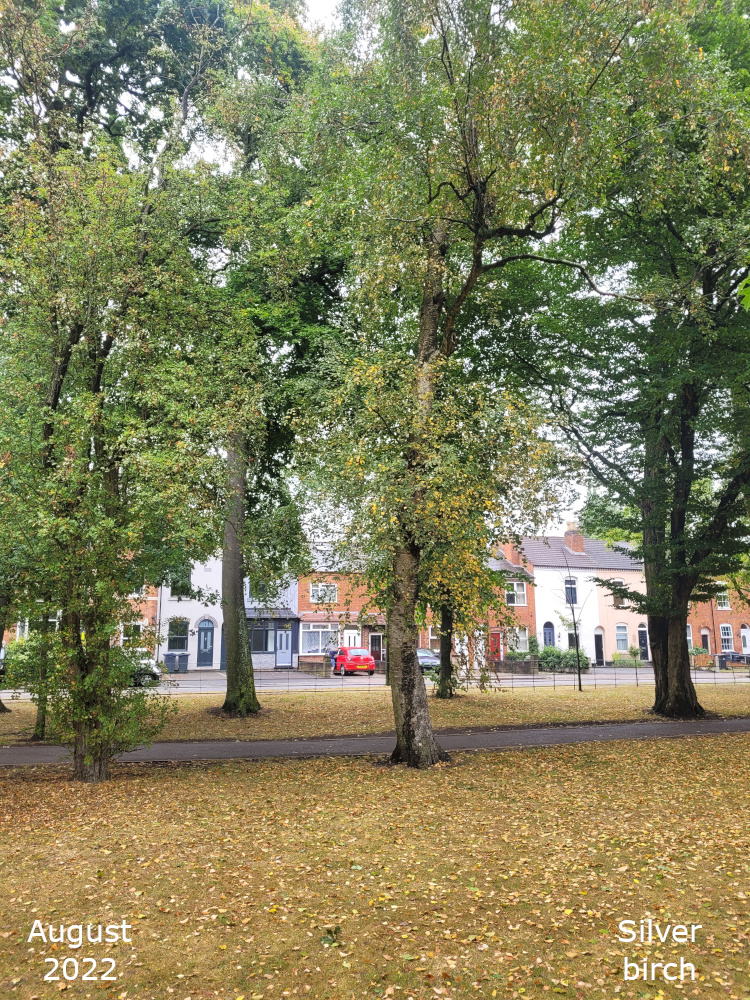 The small wooded area between the car park and the path has a Silver birch at one end. Just over the path, beside the old tennis courts, there is another Silver birch looking a bit like a scarecrow. Following that path towards the Thrive garden there are three more Silver birch near the end.