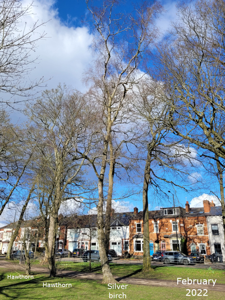 There are four Silver birches stretched out along the length of the park alongside Avenue Road. The first is near the small playground, next to the fence. The next one is at the top end of the path going towards the car park, just before the path forks of to the left. It’s in a group of three trees, on the edge of the path, with two Hawthorns. The last two are together, between Avenue Road and the large playground. Photos of one of these gives some idea of what a typical Silver birch leaf looks like. Their leaves are oval with a toothed margin and a pointed tip and are about 1¼ to 2¾ inches long. They turn bright yellow in Autumn. One photo also shows newly developing fruit. After the female catkins have been pollinated, by wind-borne pollen, they thicken and will eventually dark crimson and produce masses of seed which will be dispersed by the wind.