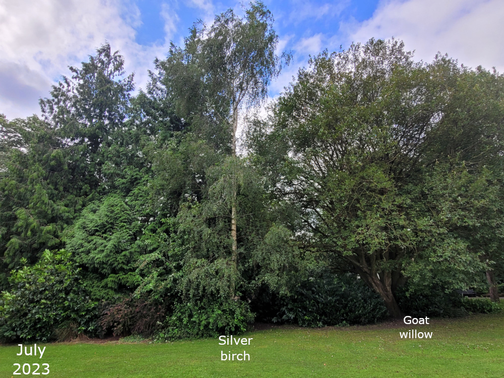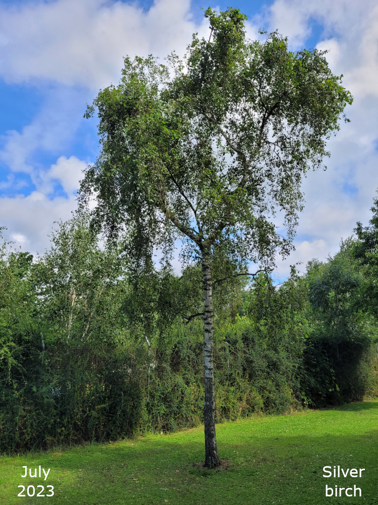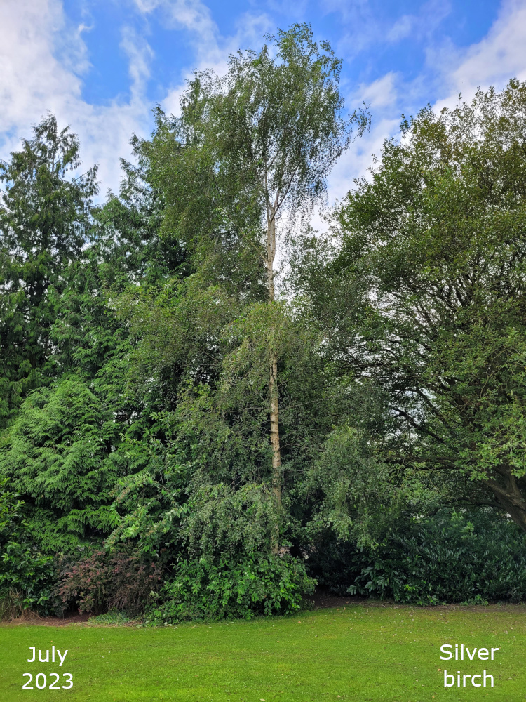 Now, I know that not all of those trees are Silver birches, but the ones that are are easily picked out by the bright white bark on their trunks. Two of the trees on the right are Silver maples which shows up in the summer picture, contrasting to the two Silver birches, with weeping branches, in the centre. These may be Betulus pendula Youngii. The other Silver birches have a more upright growth.