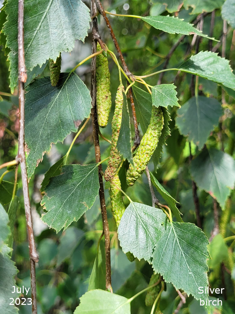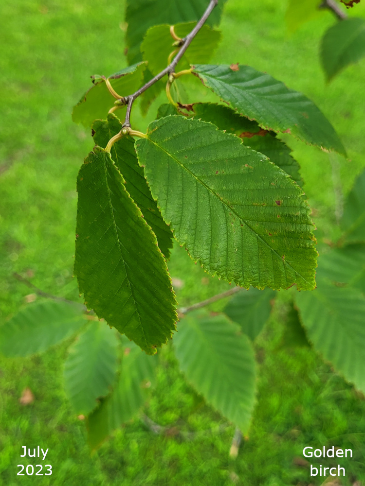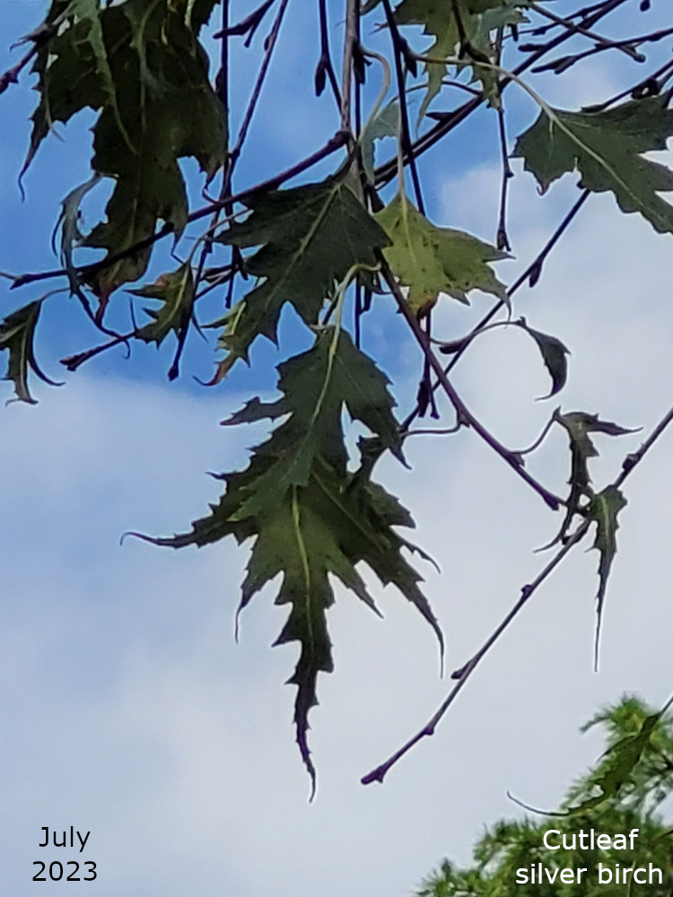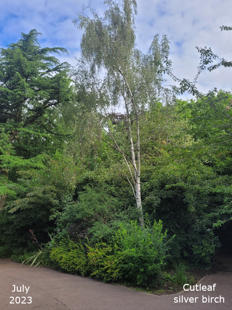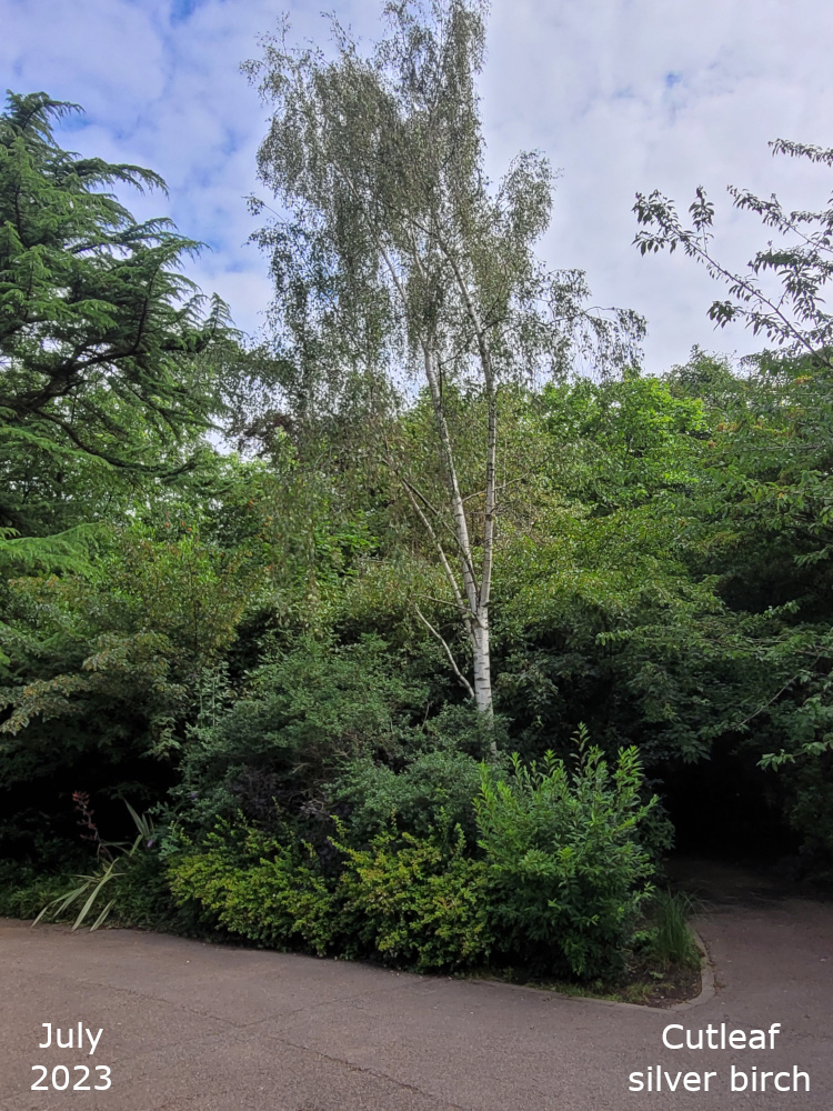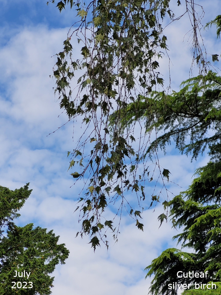 There are several birch along the path running parallel with the drive from the main entrance, all the way up to the white house. One is behind a group of trees on the corner of the field. Two more are close by alongside the path. The fourth is a Black river birch, Betula nigra, and is in the triangular area, not far from the car park. On the opposite side of that triangular area there is a newly planted Golden birch, Betula alleghaniensis. It’s only a very small tree still. There is a Silver birch on the drive next to the little parking bay just before the entrance to the yard and another one near the entrance to the car park. The final tree is the other side of the car park, on the corner of the path where it goes into the pond area. It is not an ordinary Silver birch as its leaves are different, it’s a cut-leaf birch, Betula pendula Laciniata.