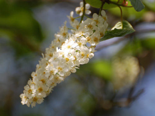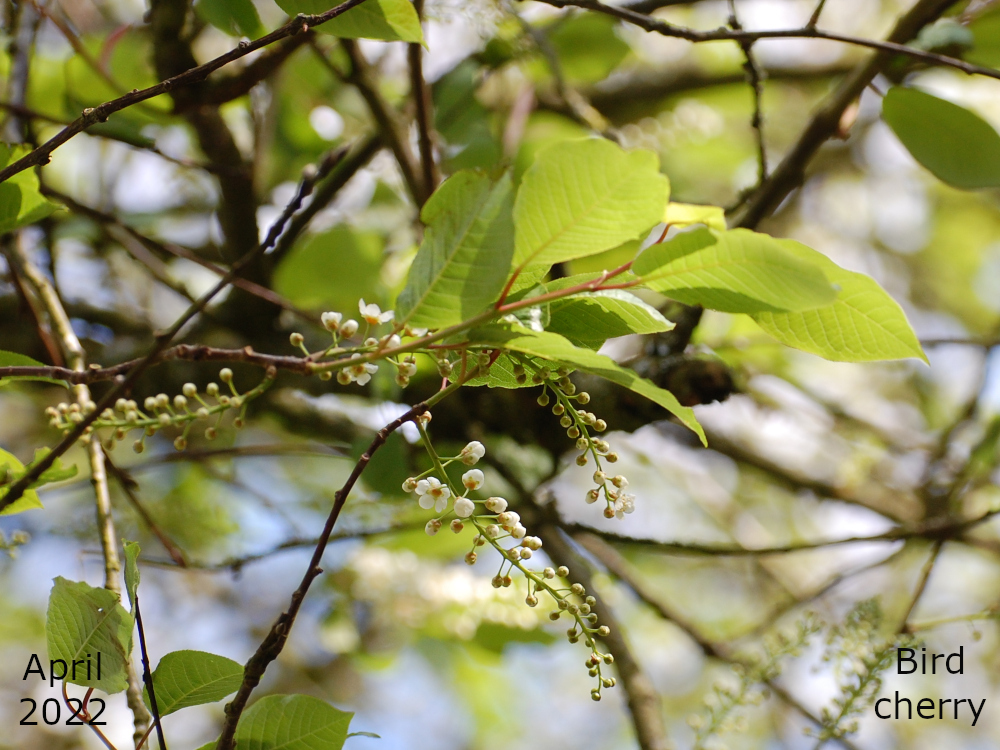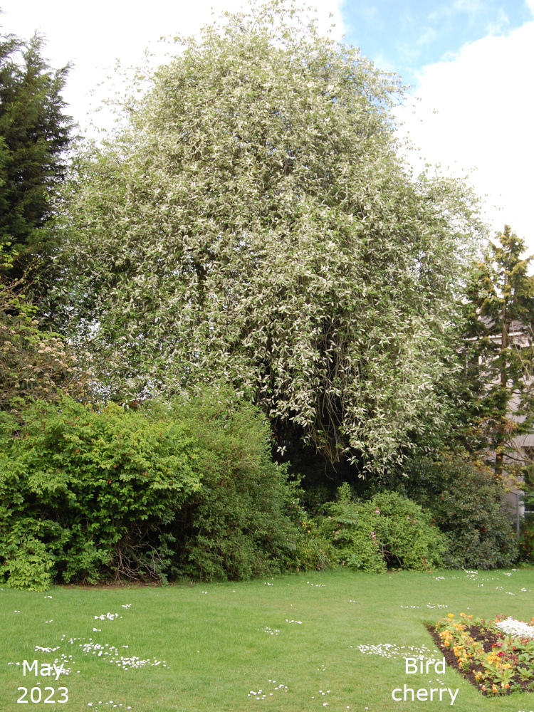 This large Bird cherry is behind the flower beds near the white house.