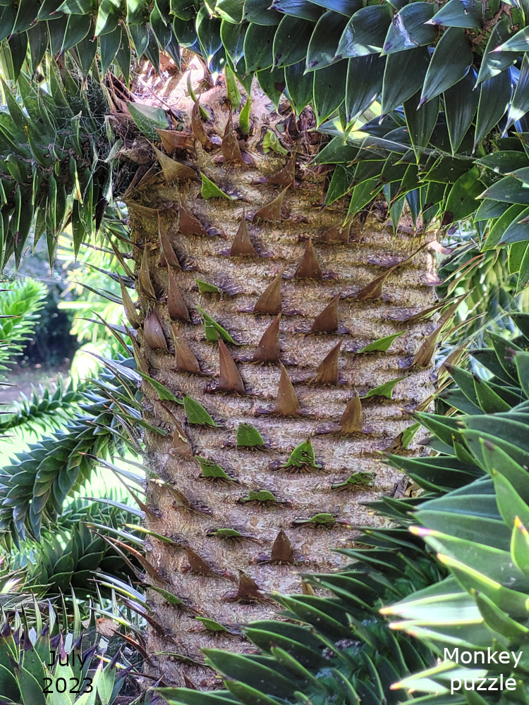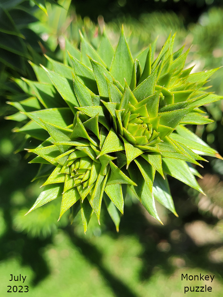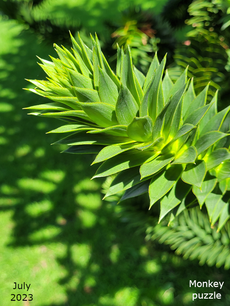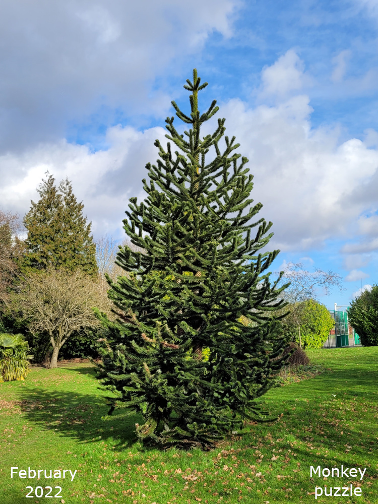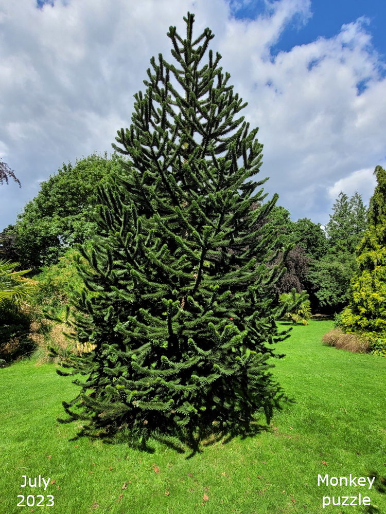 The monkey puzzle is in the middle of the colour garden, which is below the bowling green. The Monkey puzzle tree is a native of Chile and Western Argentina and its Latin name, Araucaria araucana, is derived from the name of indigenous people in that region, some of whom harvest the nuts from the tree as part of their diet.