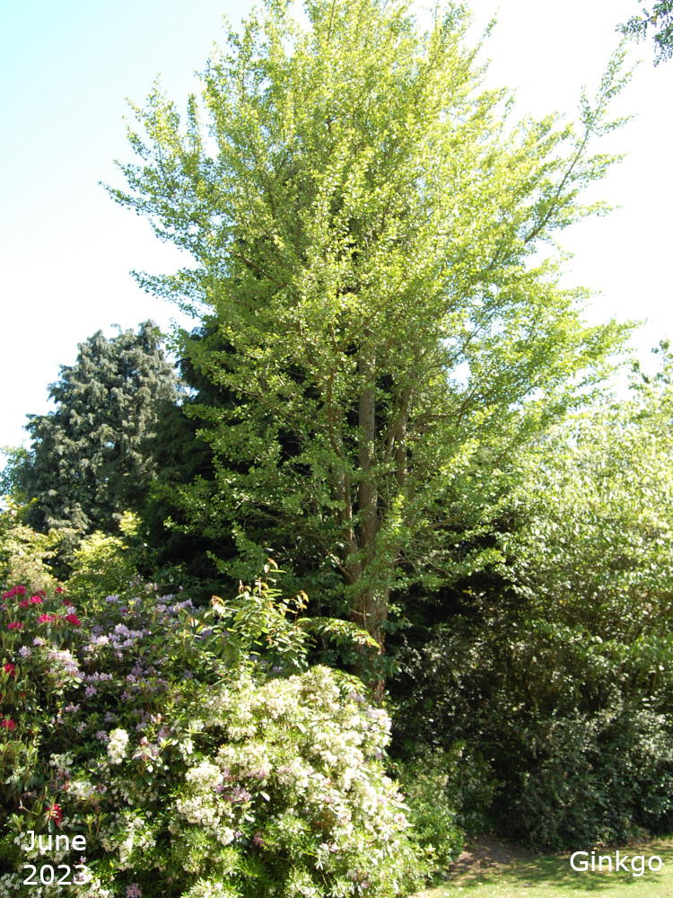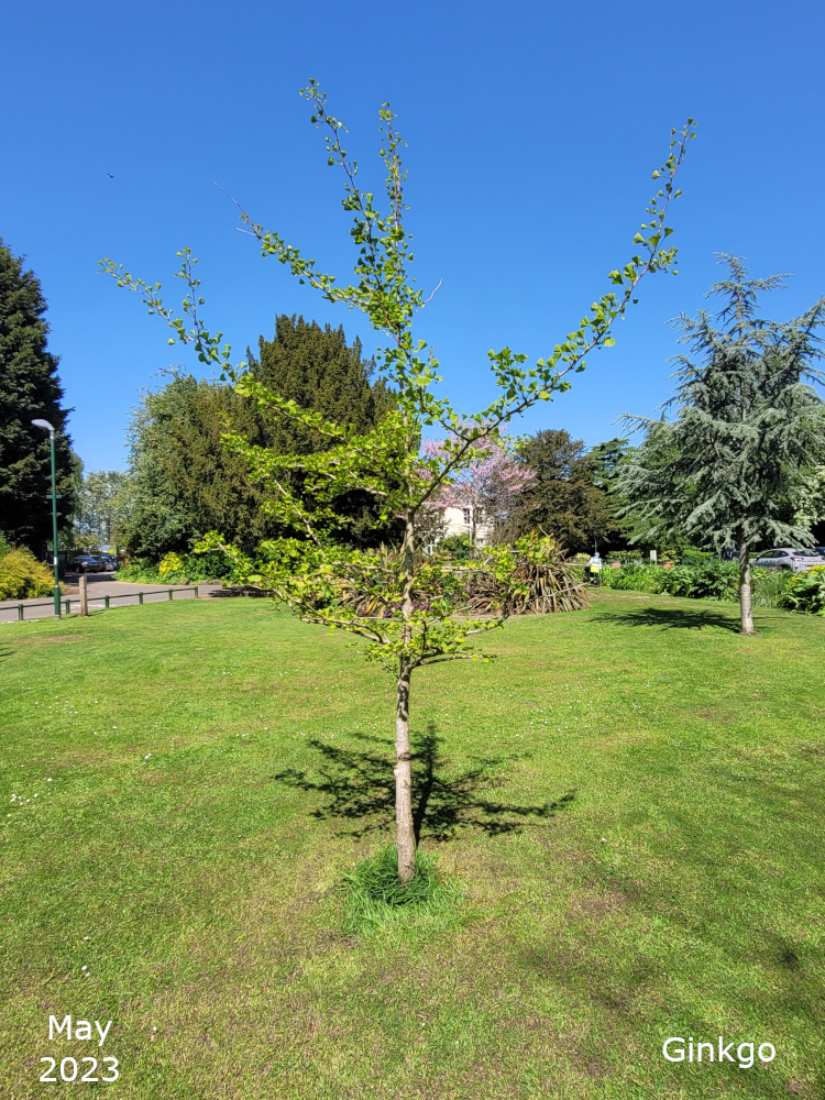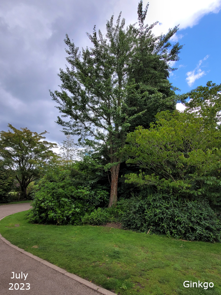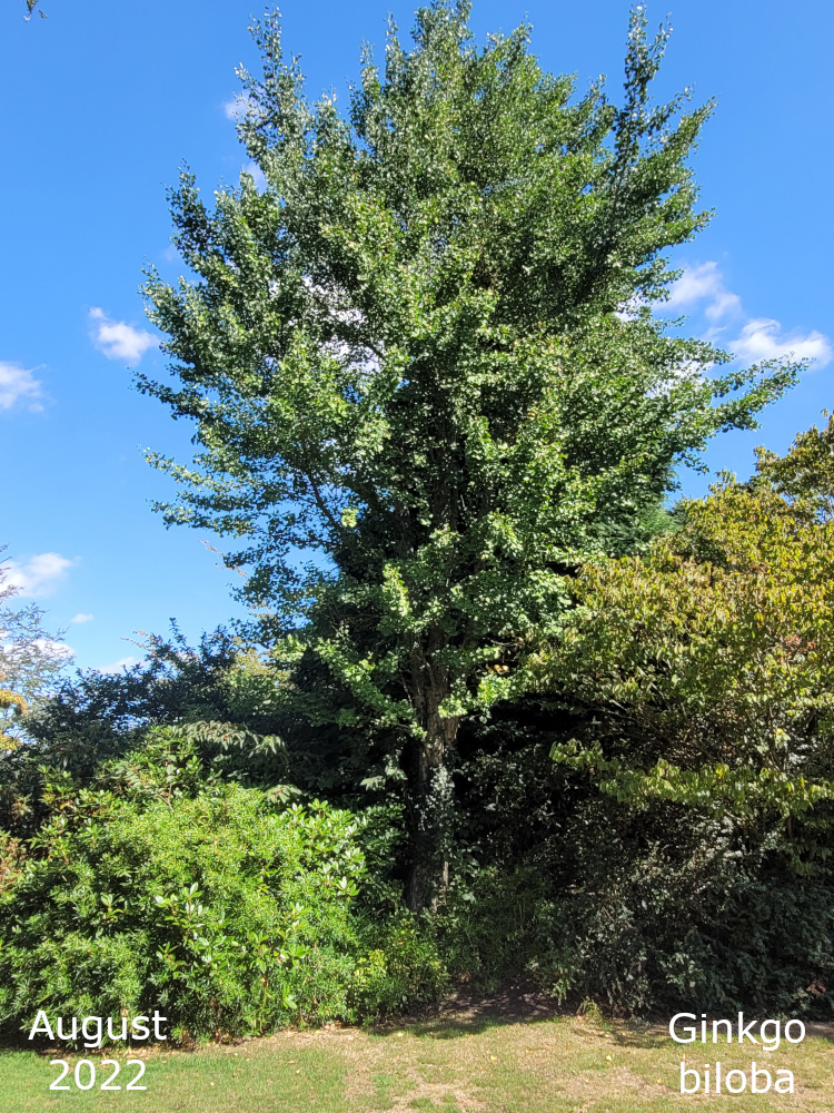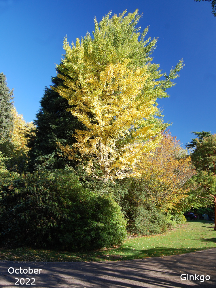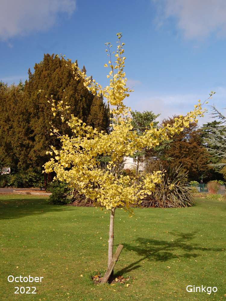 The Ginkgo trees are also known as Maidenhair trees. Their Latin name, Ginkgo biloba, refers to their leaf shape which is a distinctive fan with a double lobe. The leaves turn a golden yellow in autumn. The tree is a native of China and is the only living species in the entire Order of Ginkgoales.