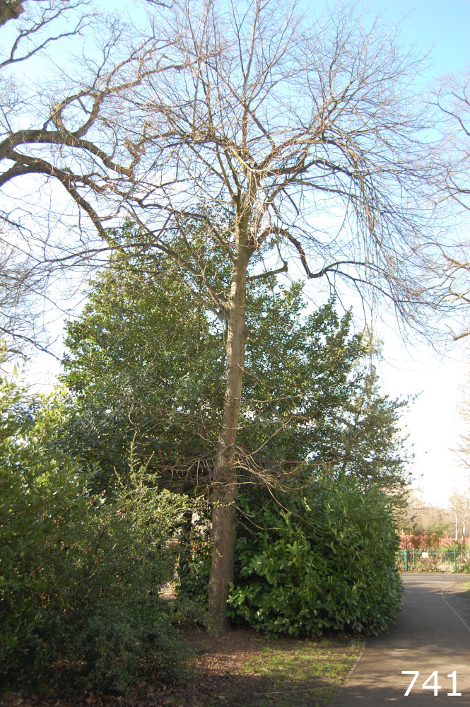 About a third of the way along the path from the playground to the car park, just past a metal bench and half-way between path and fence, this slender Lime tree jostles with all the others around it for light.