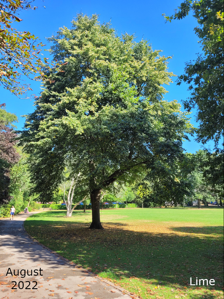 There’s a triangular pattern of pathways near the car park and halfway along the long side of that triangle, looking over towards Avenue Road is this Lime tree.