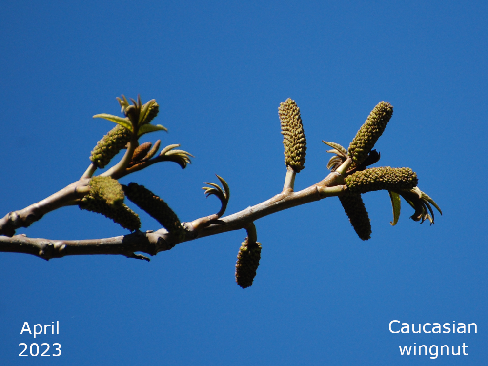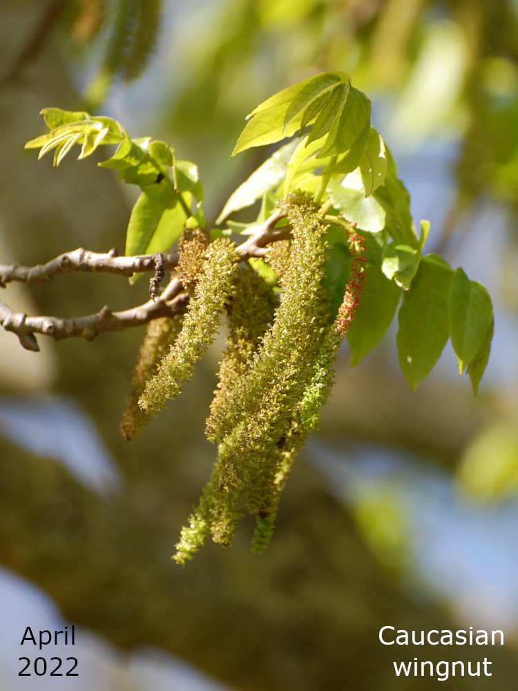 Catkins start to appear on the tree in late March. The male catkins are quite short and green. The female catkins are longer, yellow to reddish and these are the ones that grow long and dangly. Once the female flowers are pollinated the fruits begin to develop and the female catkins increase in size as the characteristic wings of the fruits develop. They are all very green to begin with but by late autumn they dry out and turn brown. The fruits are adapted to be wind dispersed – not surprising with a name like wingnut, really.