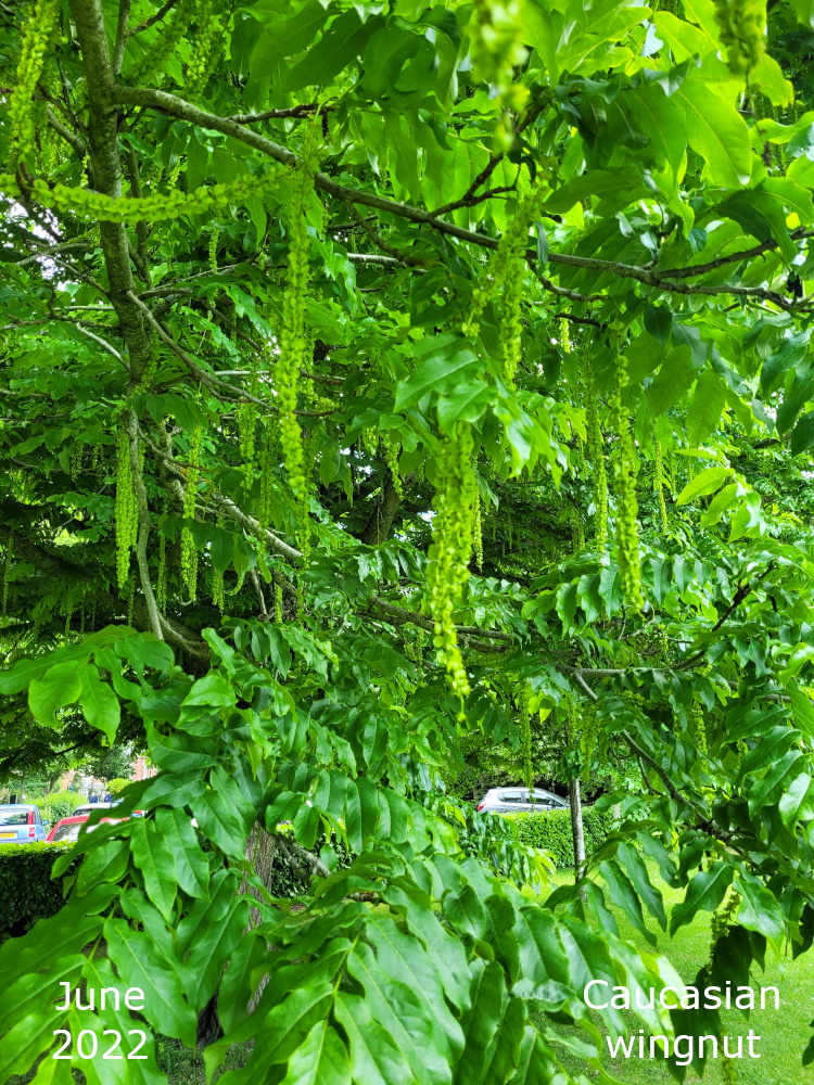 The Caucasian wingnut originates from the Caucasus region between the Black sea and the Caspian sea and was introduced to Britain around 1800. The name Pterocarya is derived from the ancient Greek ‘Pteron’ for wing and ‘karyon’ for nut. The species name, ‘fraxinifolia’ means the leaves are like those of an Ash tree – Fraxinus excelsior.