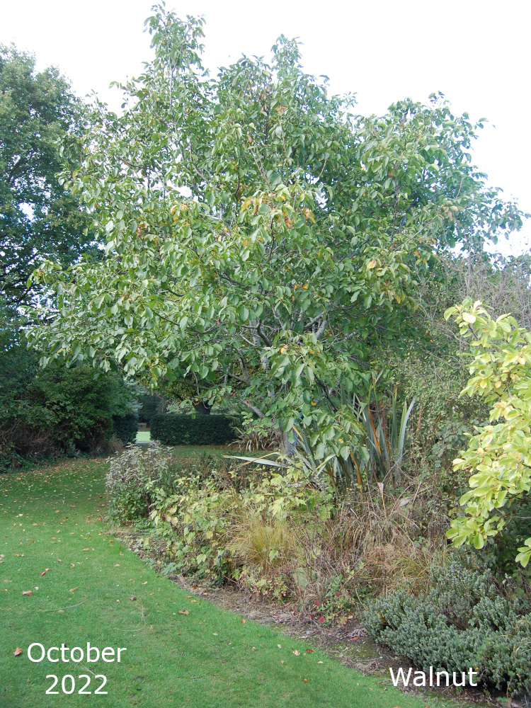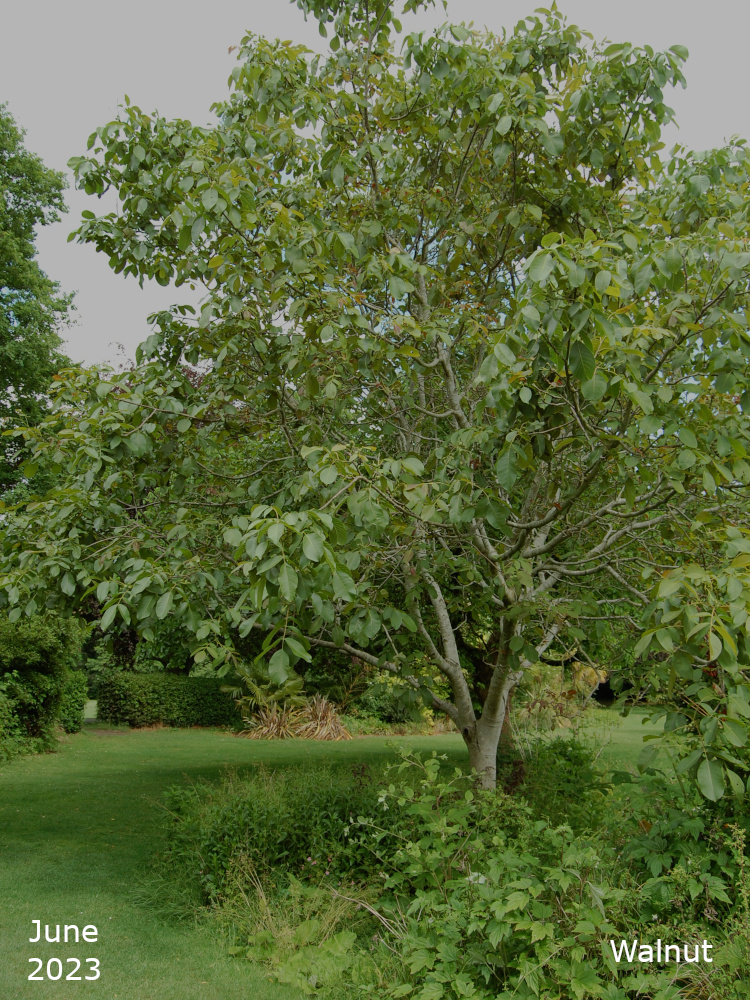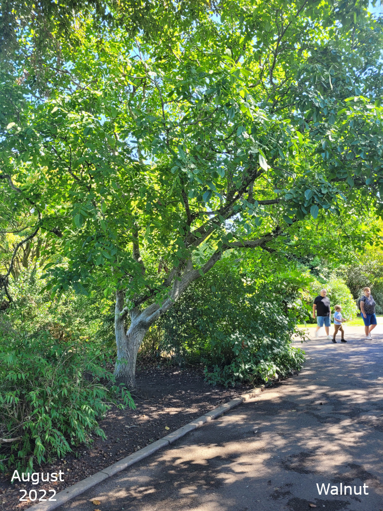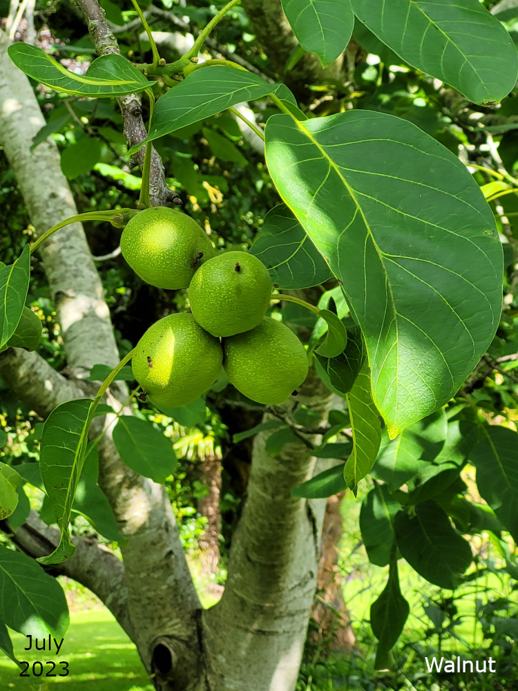 There are two of these trees, Juglans regia, both near the bowling green. Both trees regularly produce nice green fruits which never get the chance to ripen before the squirrels have eaten them.