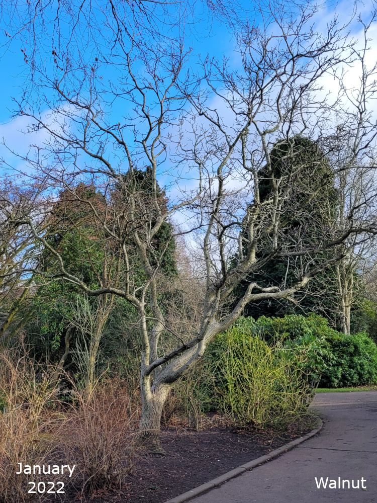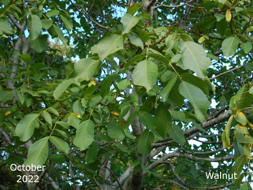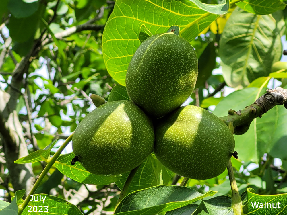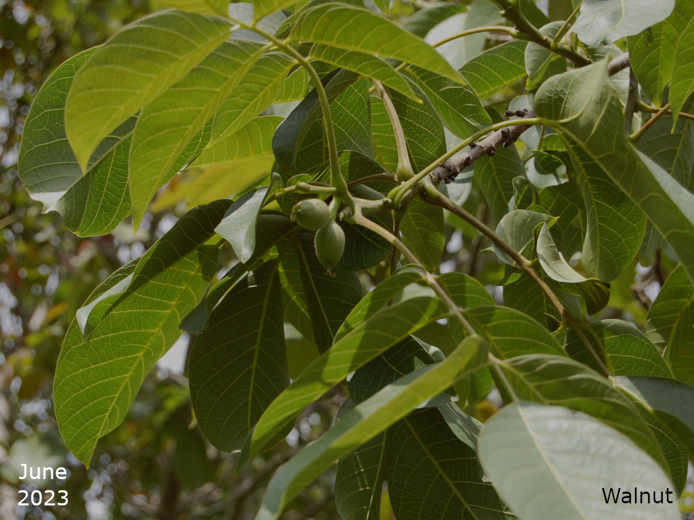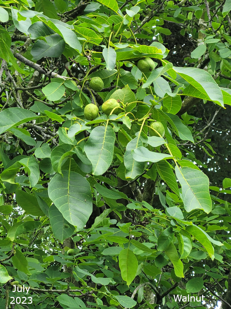 There are two of these trees, Juglans regia, both near the bowling green. Both trees regularly produce nice green fruits which never get the chance to ripen before the squirrels have eaten them.
