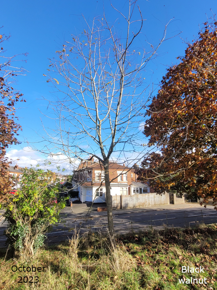 This is the only Black walnut tree, that I know of, in the park. It is near the end of the large playground on the embankment overlooking Avenue Road. The leaves are very different to the English walnut; they look more like an Ash tree as they are a pinnate leaf with several leaflets either side of a long leaf stalk. This tree is a native of North America and likes a wet habitat, usually along river banks.